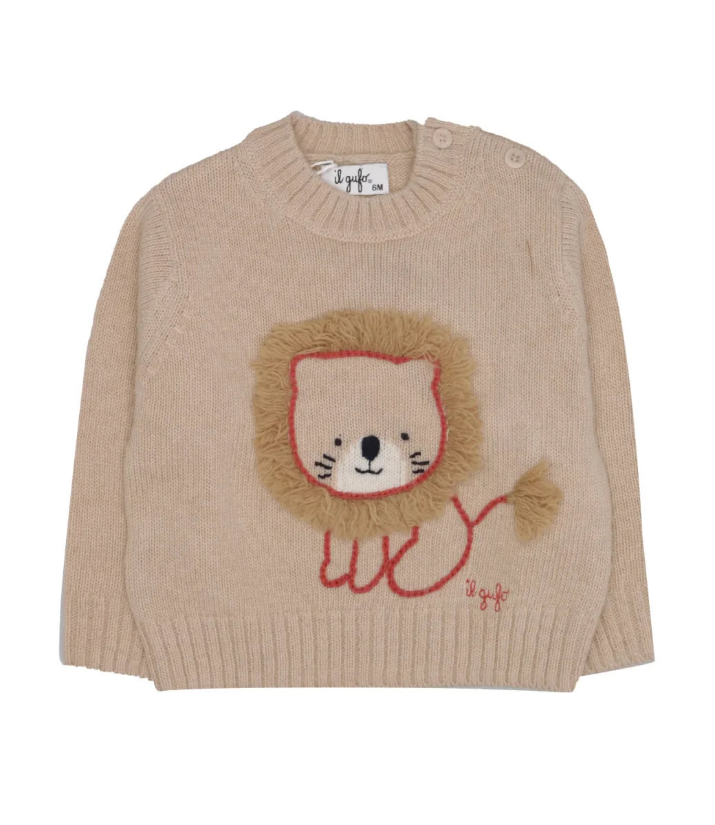 Maglia Il Gufo in lana merino, girocollo a costine, chiusura con bottoni sulla spalla sinistra, leone ricamato sul torace con dettaglio di sfrangiatura, maniche lunghe con polsini, fondo dritto, finiture a costine.