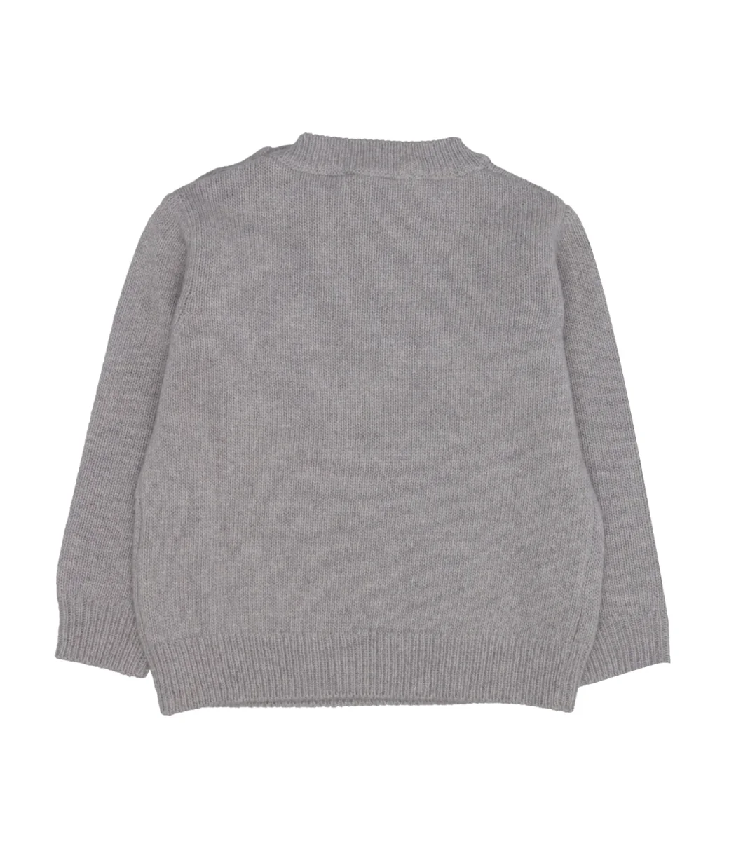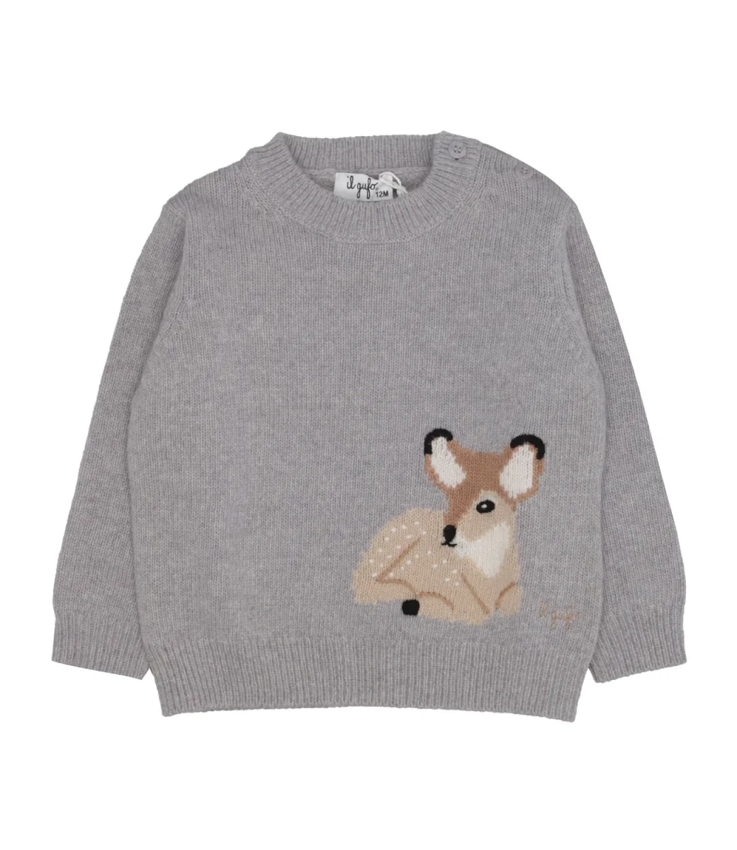 Maglia Il Gufo in lana merino, girocollo a costine, chiusura con bottoni sulla spalla sinistra, ricamo a mano di un cerbiatto sul davanti, maniche lunghe con polsini, fondo dritto, finiture a costine.