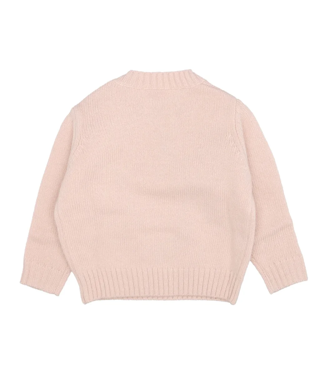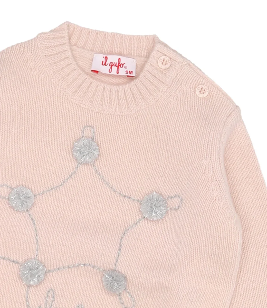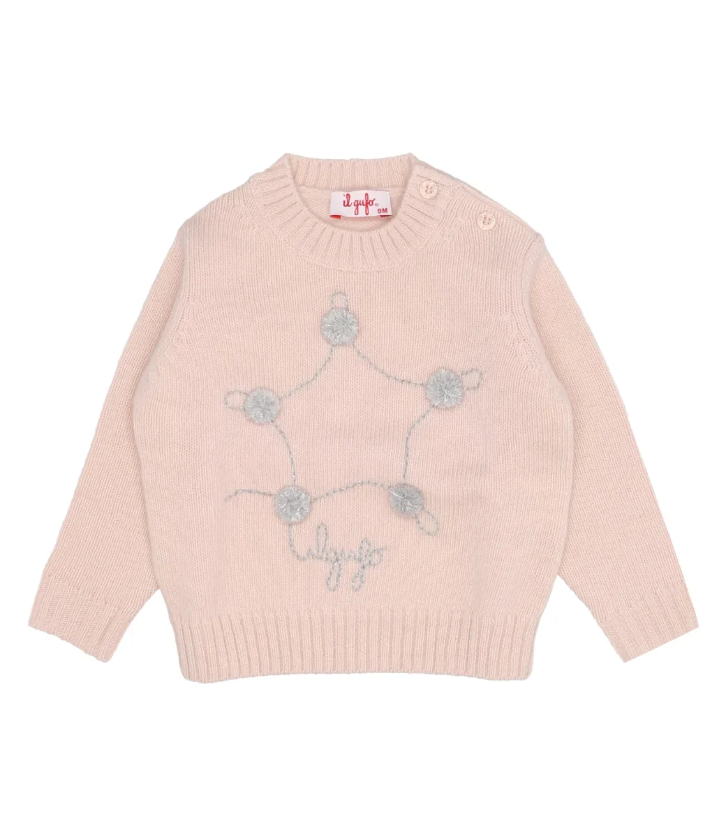 Maglione girocollo in pura lana merino extra fine certificata ®Woolmark di colore rosa con stella frontale ricamata a mano in filato misto lurex, impreziosita da pom pon e logo. Finiture di collo, polsini e fondo realizzate a costine per un fitting ancora più confortevole.