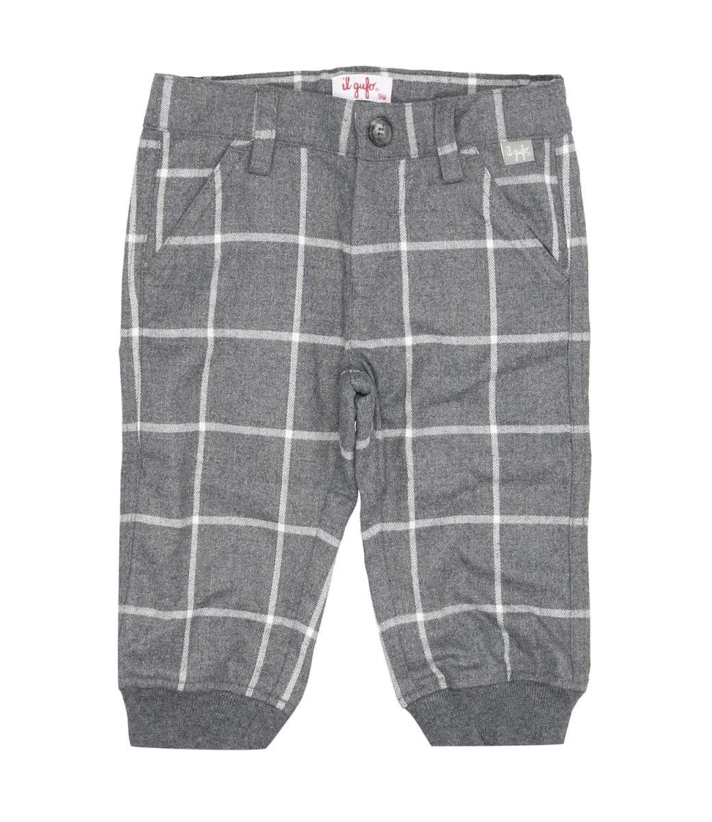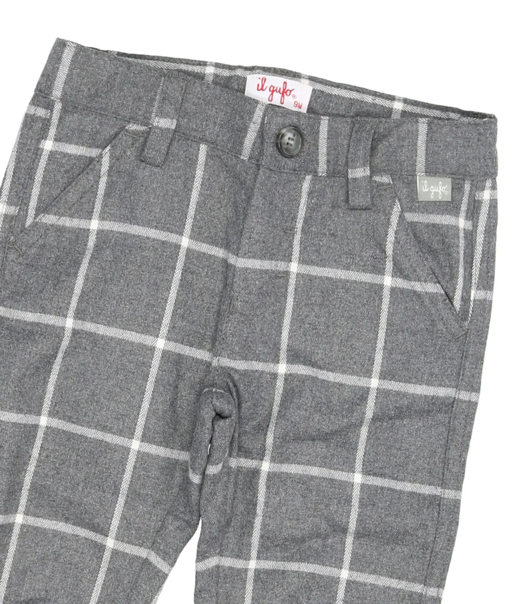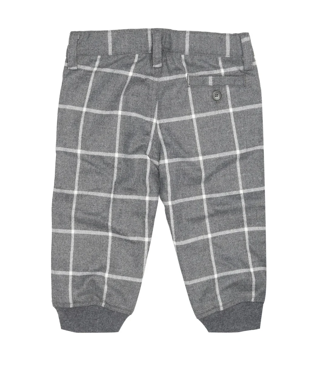 Pantaloncino da neonato in caldo tecnowool fantasia check bianco su base grigia con bottone di chiusura e passanti per cintura in vita. Fondo con polsini elasticizzati, tasche laterali alla francese e tasca posteriore a filetto con bottone. Pratico elastico interno per la regolazione del fitting.