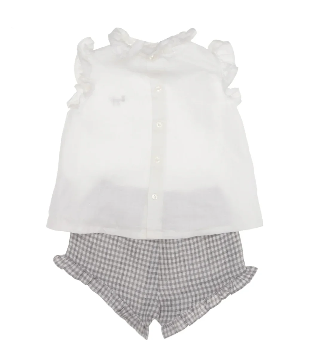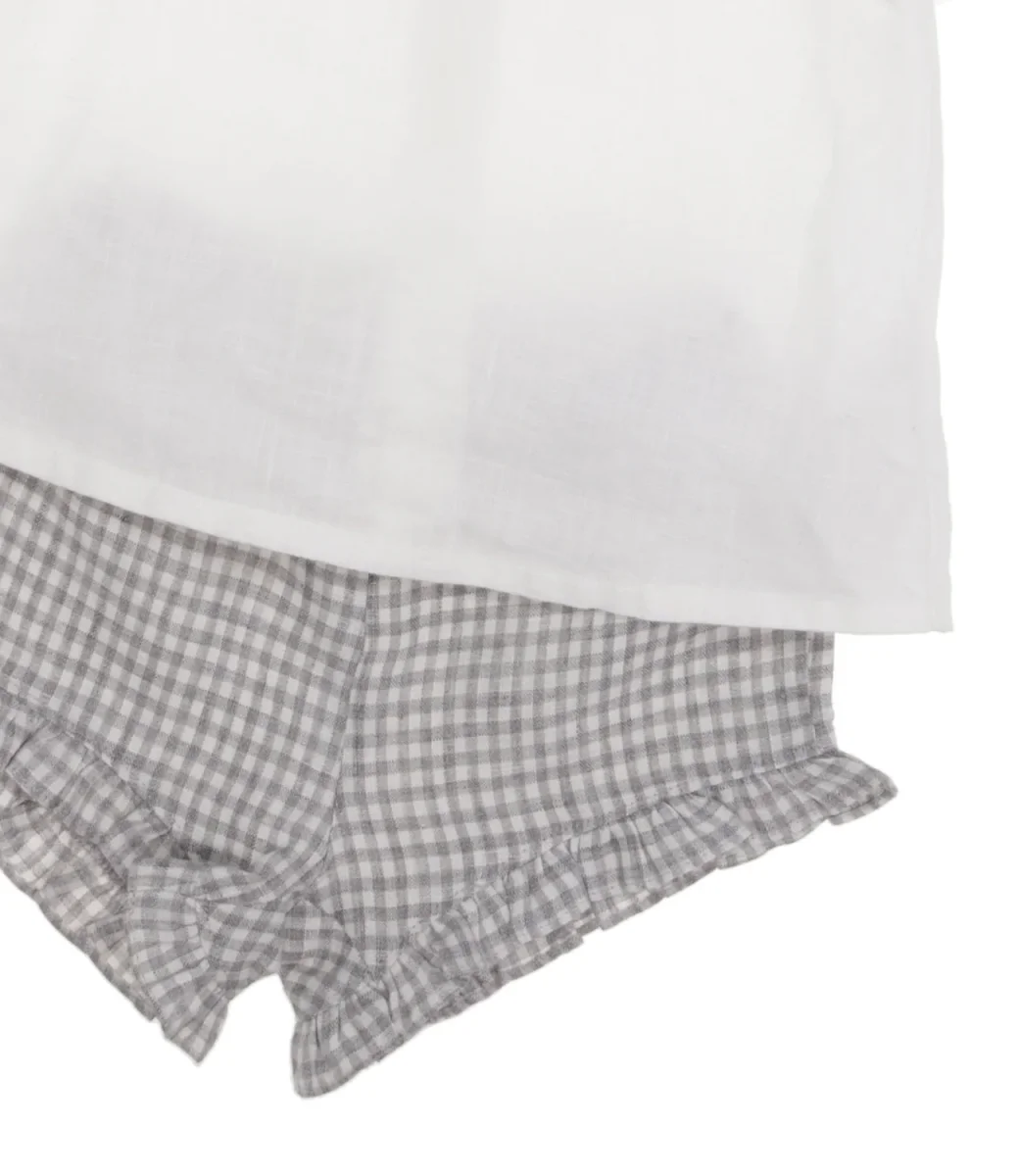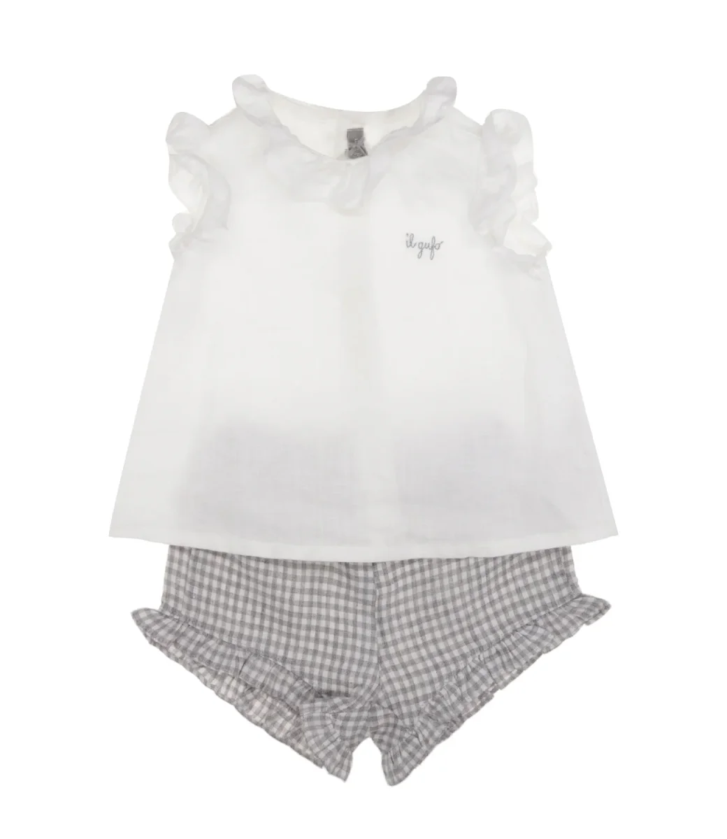 Completo Il Gufo due pezzi in 100% lino composto da un top smanicato dal design svasato di colore bianco impreziosito da una ruche sul giromanica e al collo. Logo ricamato a contrasto a lato e chiusura sul retro con bottoni. In abbinamento, una culotte in stampa vichy color grigio e bianco con elastico in vita e piccole ruche sul fondo gamba.