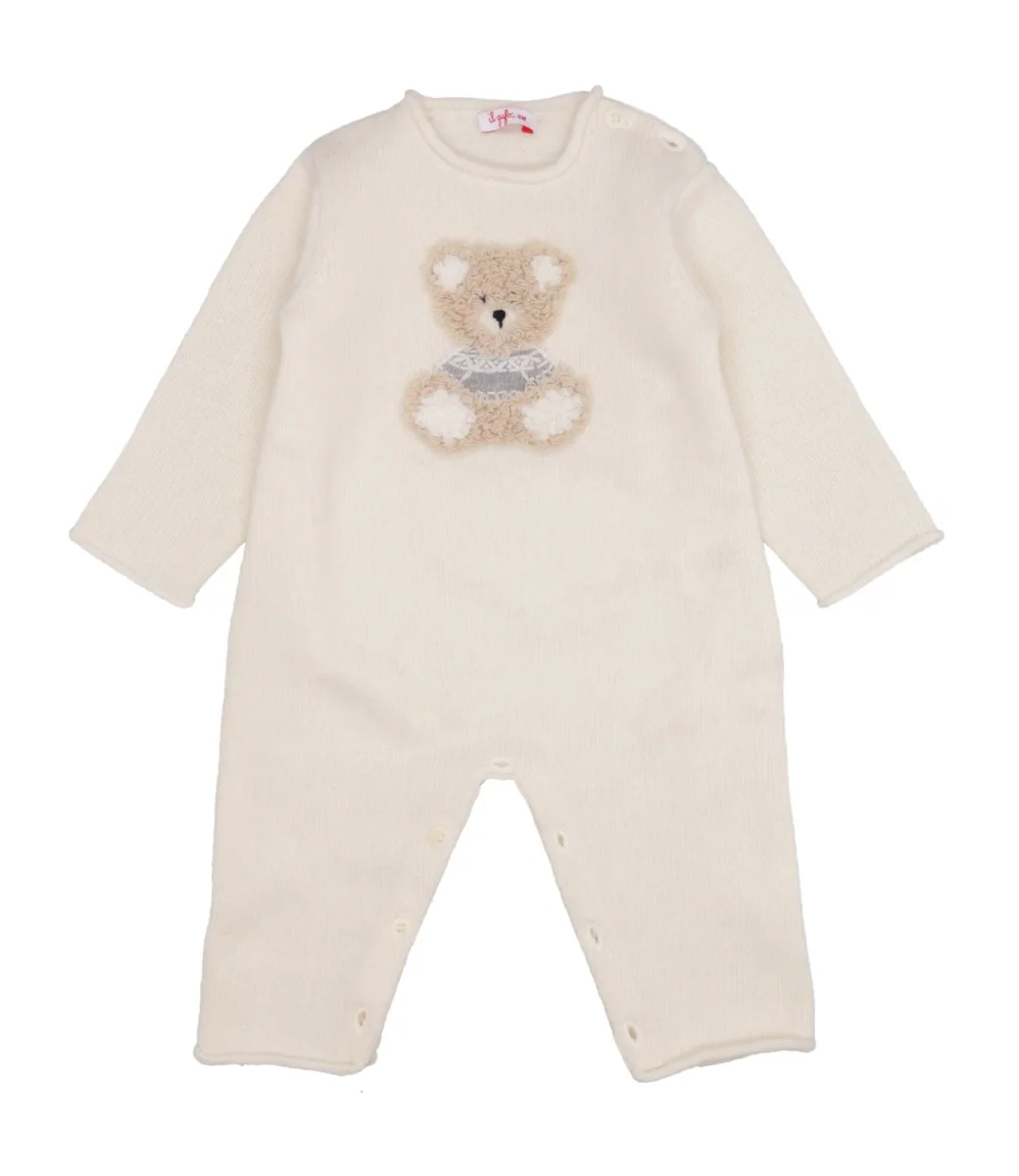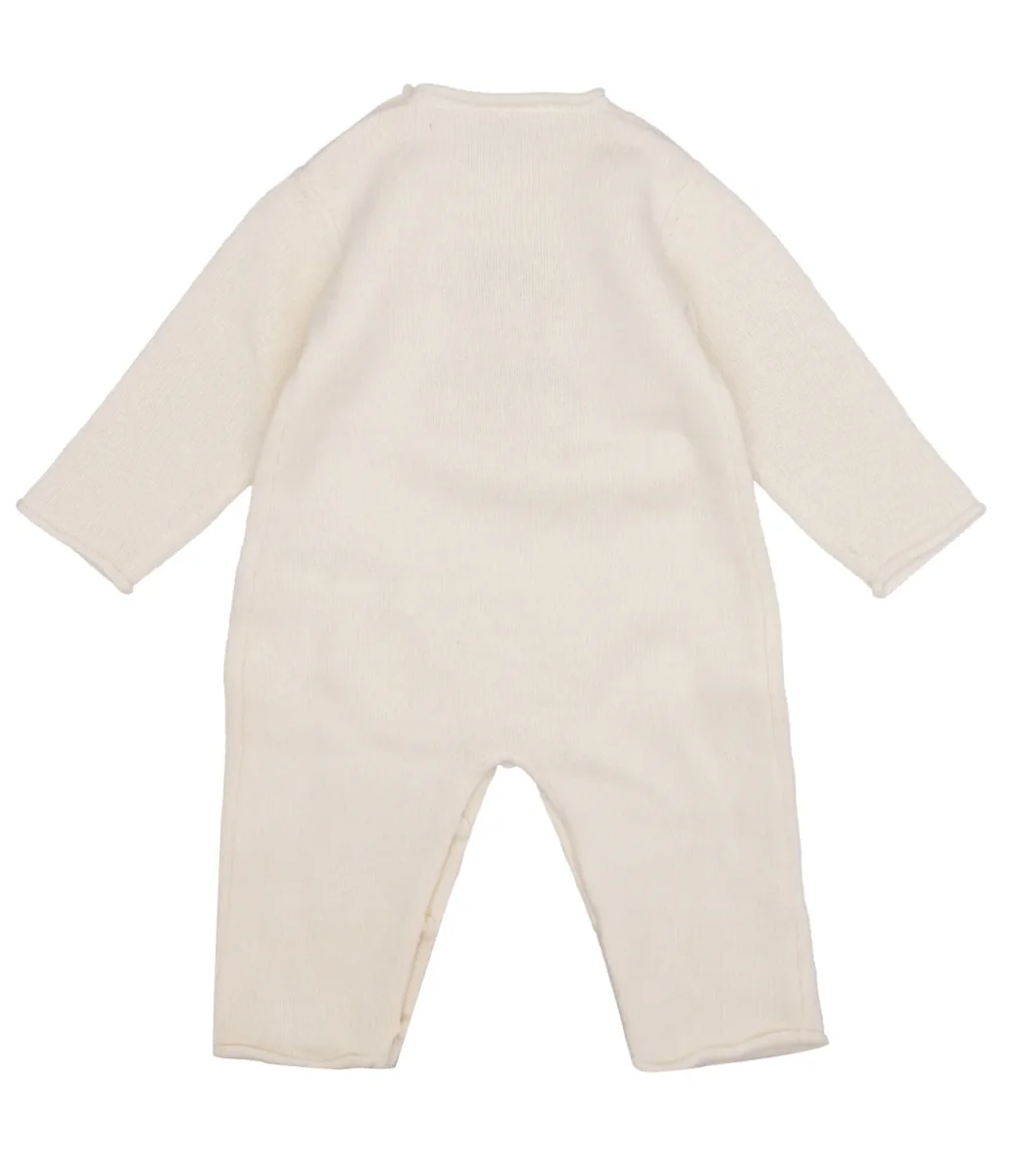 Tutina Il Gufo in lana color beige a girocollo e maniche lunghe con ricamo frontale e chiusura con bottoni sul collo e inferiore.