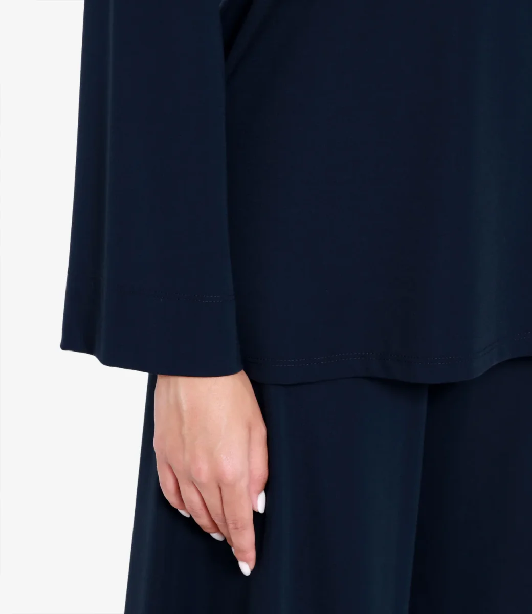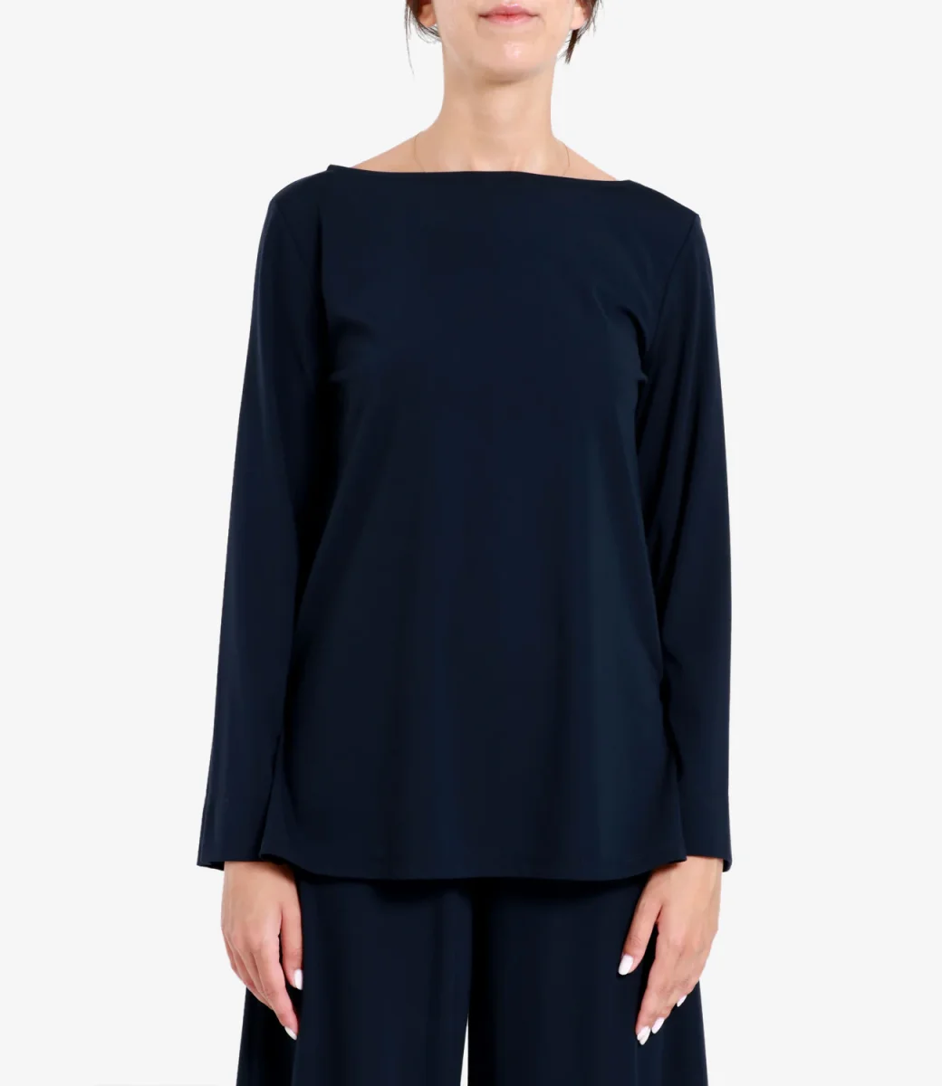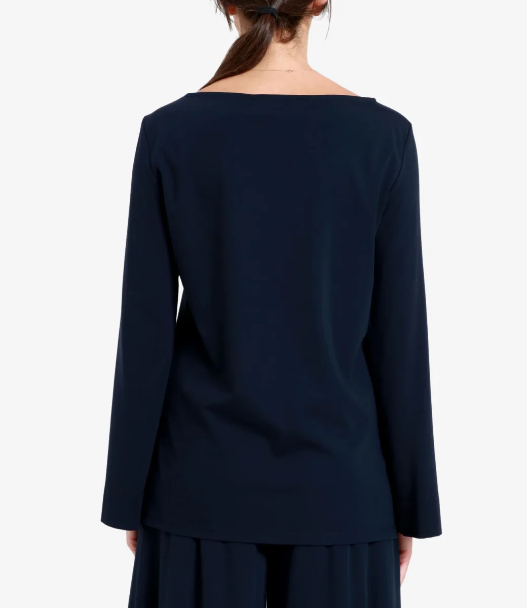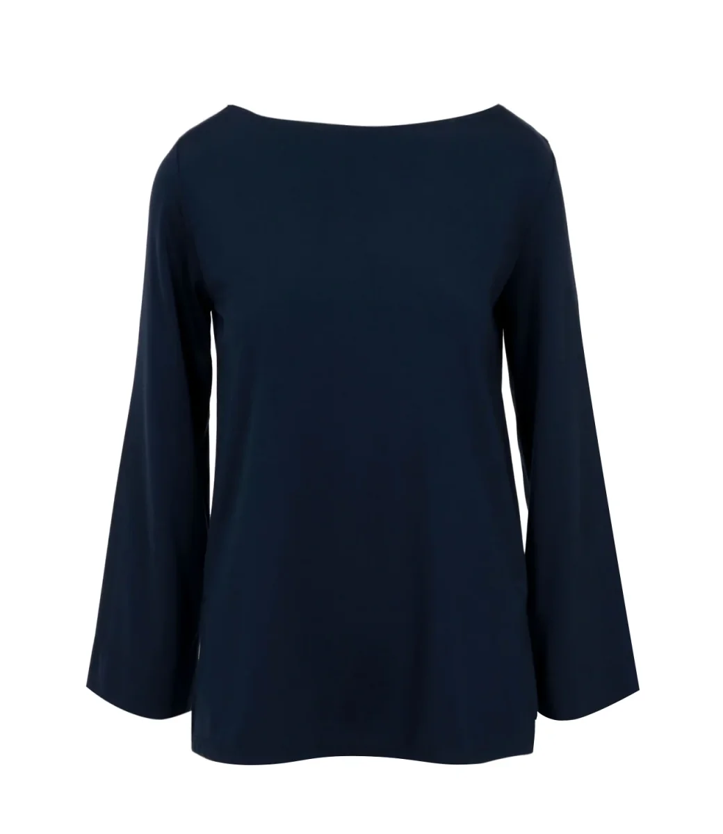 Blusa Kaos realizzata in morbido tessuto in misto viscosa elasticizzato, con scollo a barca, maniche a campana, lunghezza morbida sul bacino.