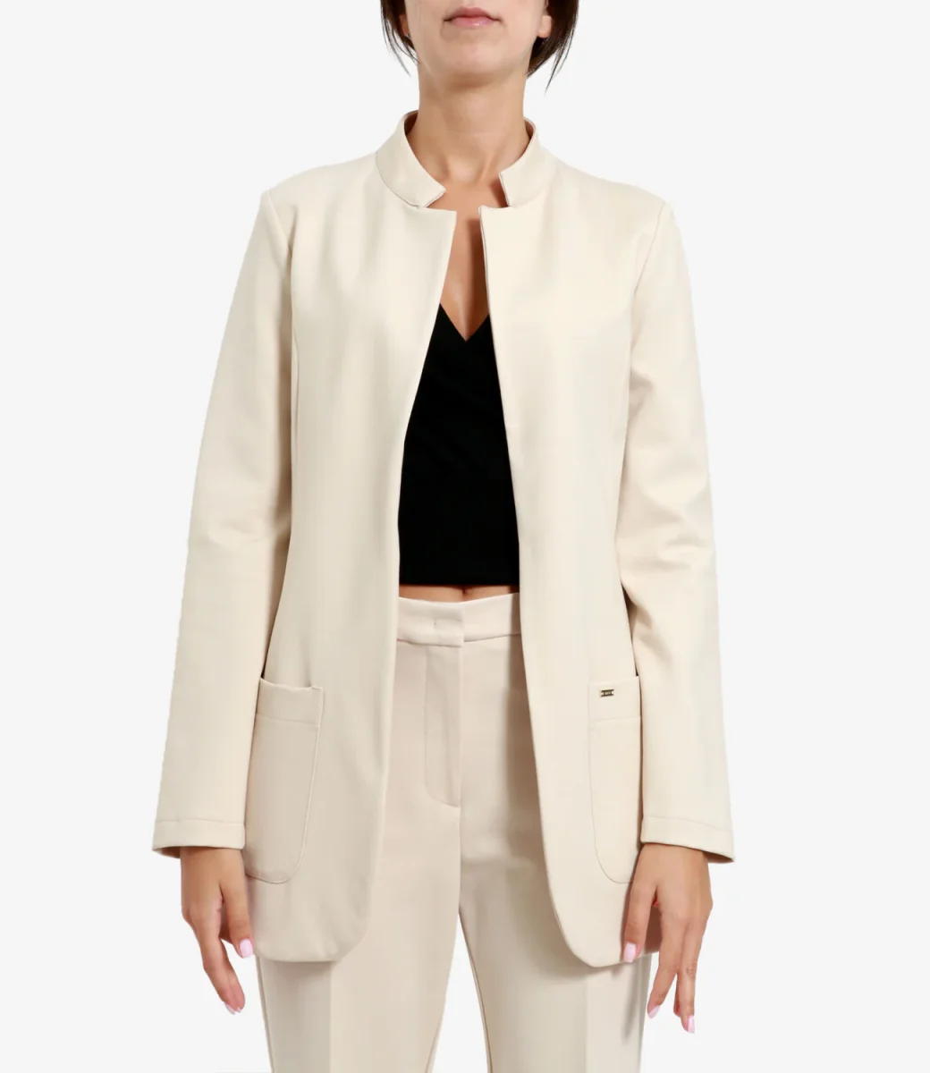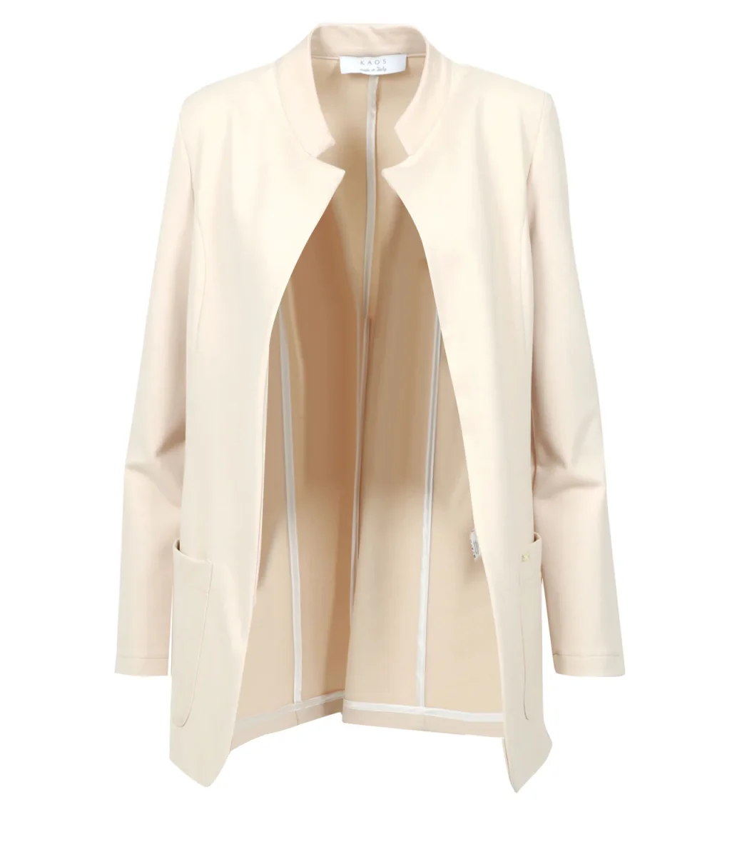 La giacca Kaos destrutturata con tasche frontali in colore beige è un capo d’abbigliamento che unisce un design contemporaneo alla praticità delle tasche frontali.