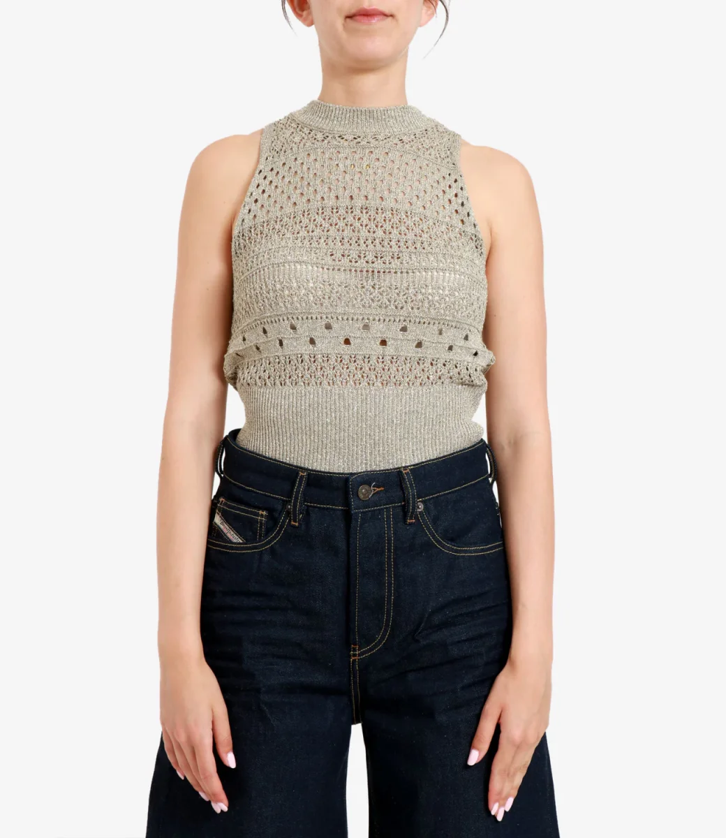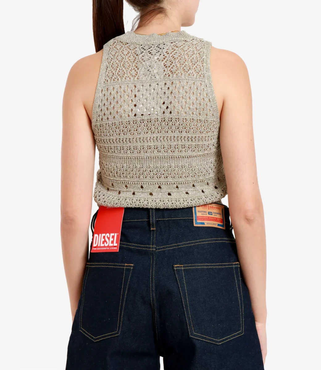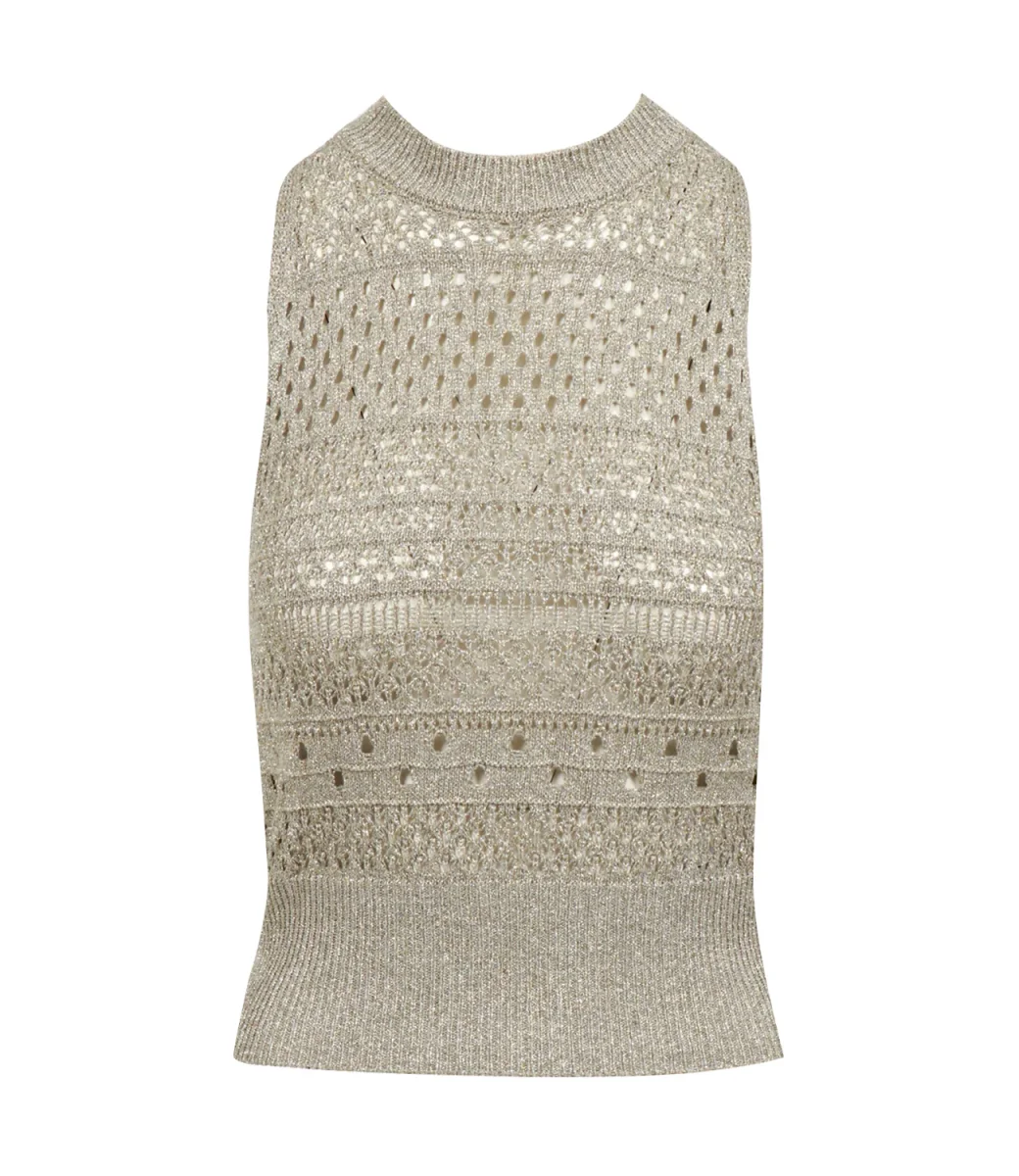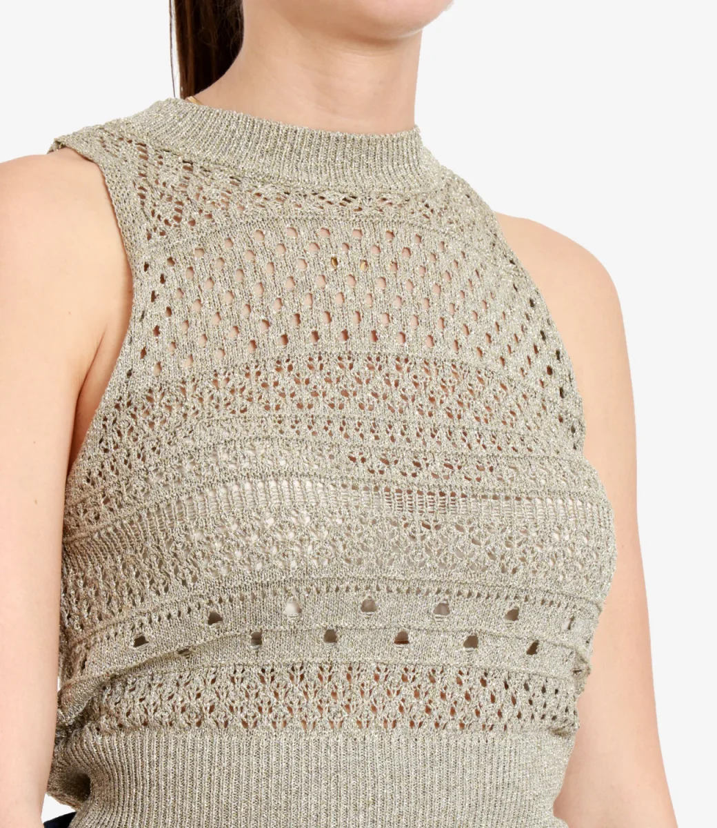 Top Kaos realizzata in filo di cotone con lavorazione a maglia intrecciata e forata. Capo che completa look nel pieno della stegione estiva.