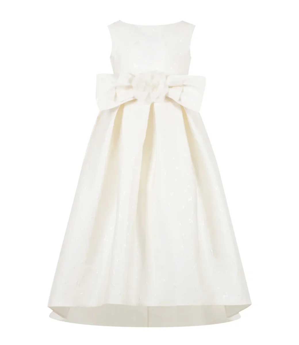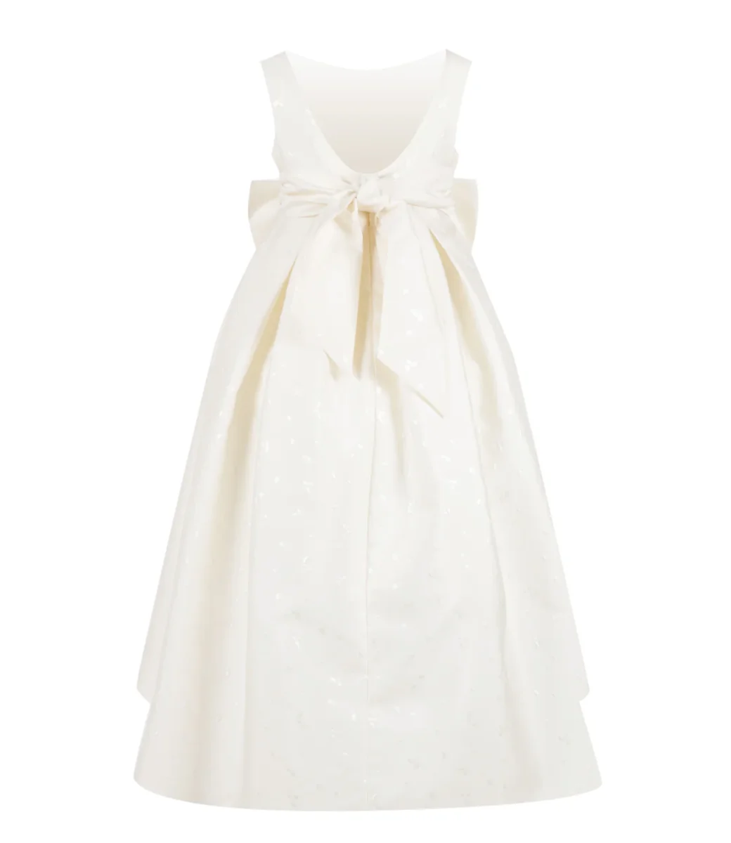 Abito La Stupenderia in misto cotone bianco, girocollo, smanicato, scollo a V posteriore, gonna svasata, cintura in vita con maxi fiocco, chiusura posteriore con zip.