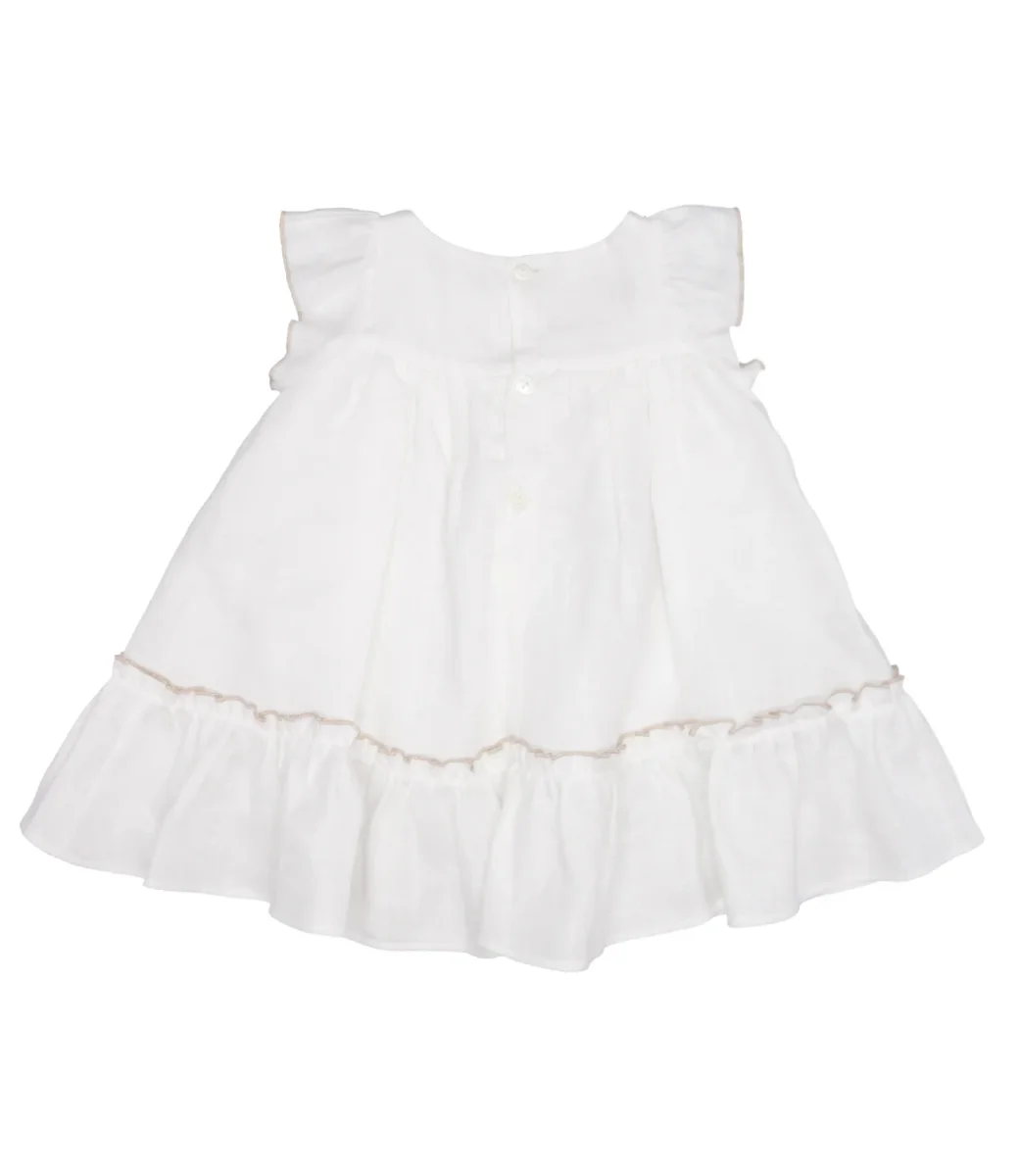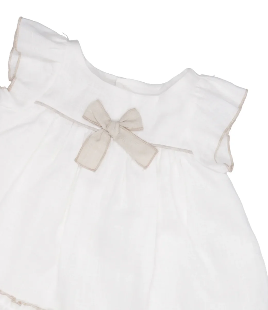 Dettagli:– Cotone– Girocollo– Maniche corte – Fiocco sul petto– Balze sulla gonna– Chiusura con bottoni