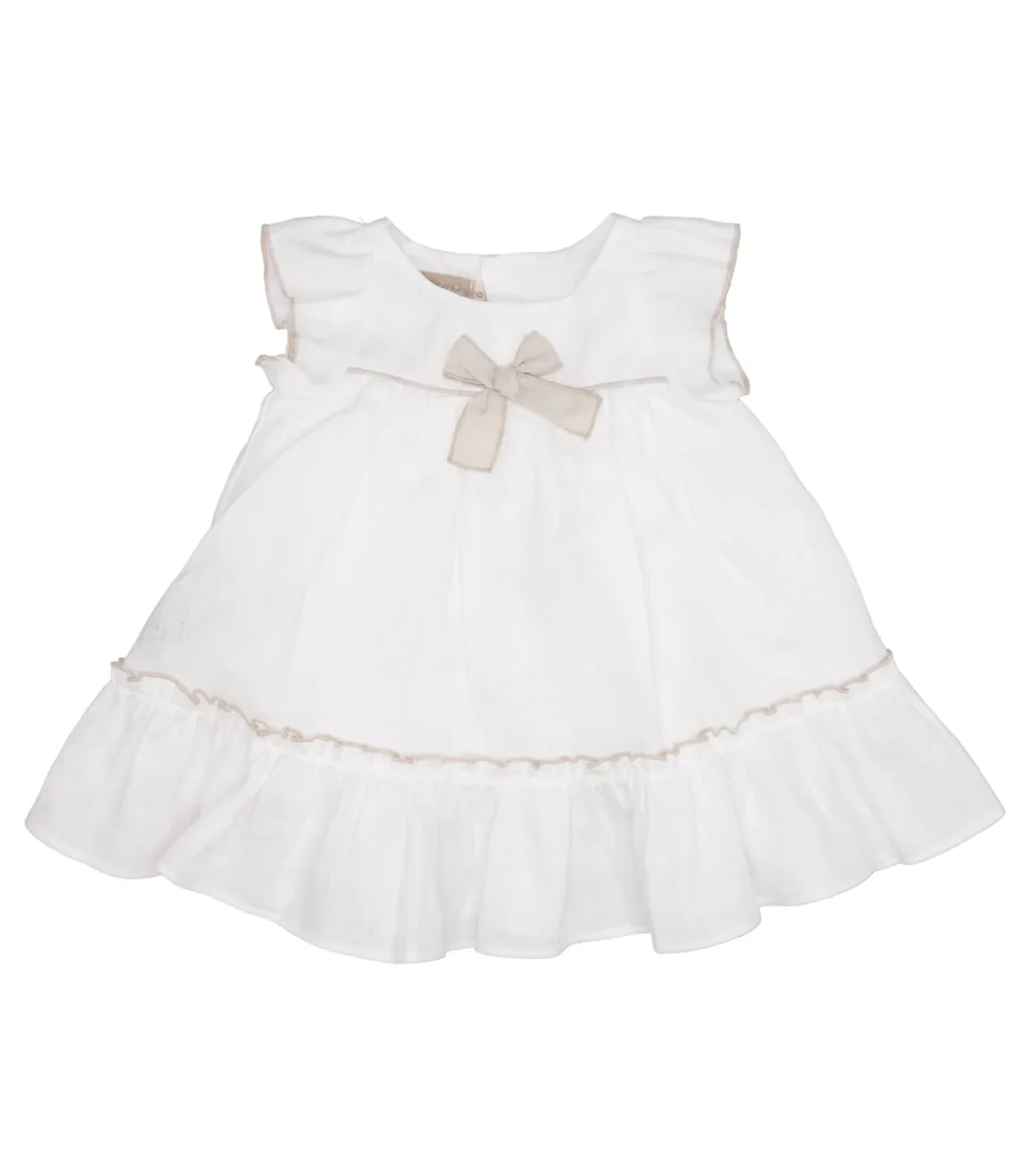Abito in cotone La Stupenderia con fiocco sul petto e balze sulla gonna.