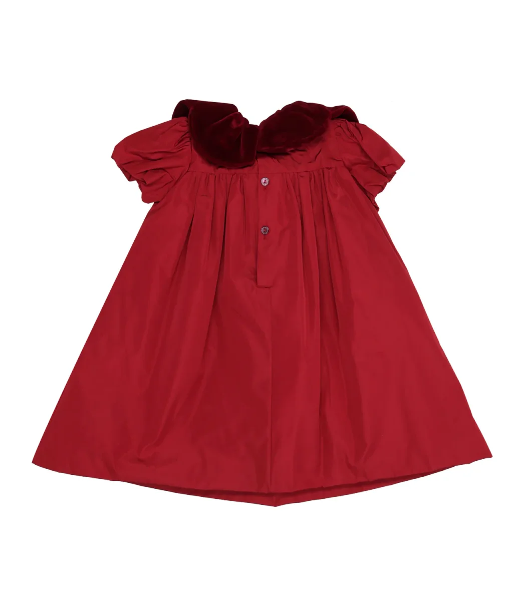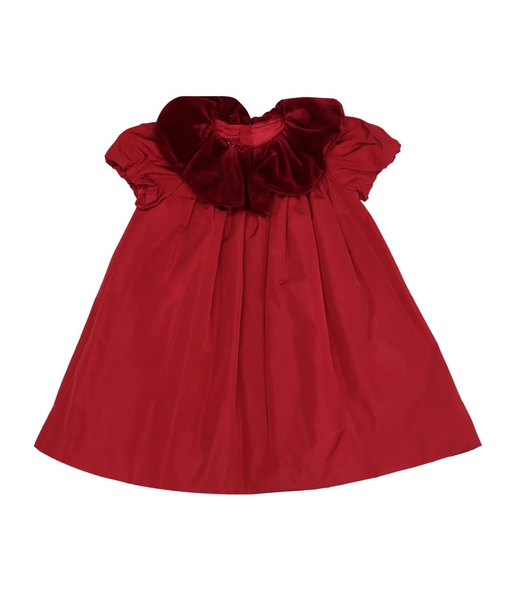 Abito La Stupenderia in taftà, con colletto a petalo in velluto, maniche a sbuffo, modello a trapezio, fondo dritto.