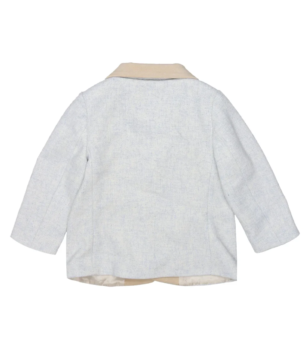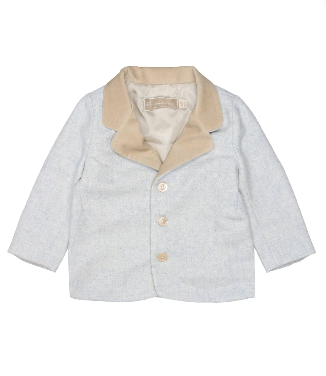 Giacca celeste con colletto in velluto beige e chiusura con bottoni beige. Perfetta per un look elegante ma casual.