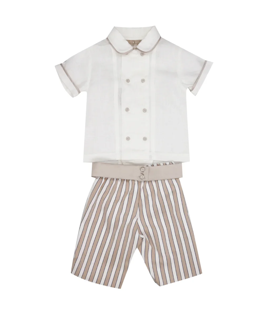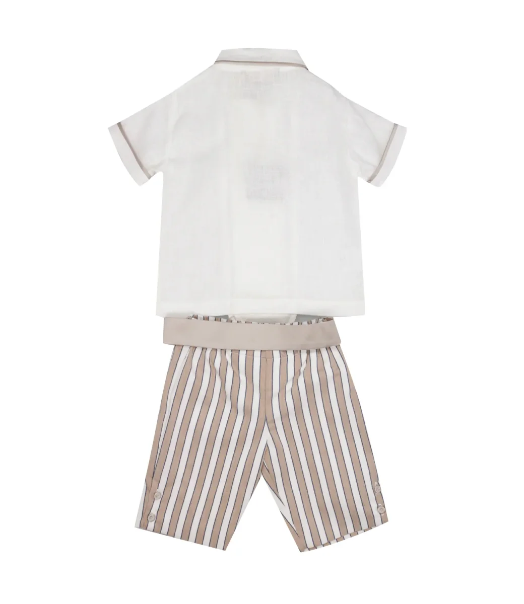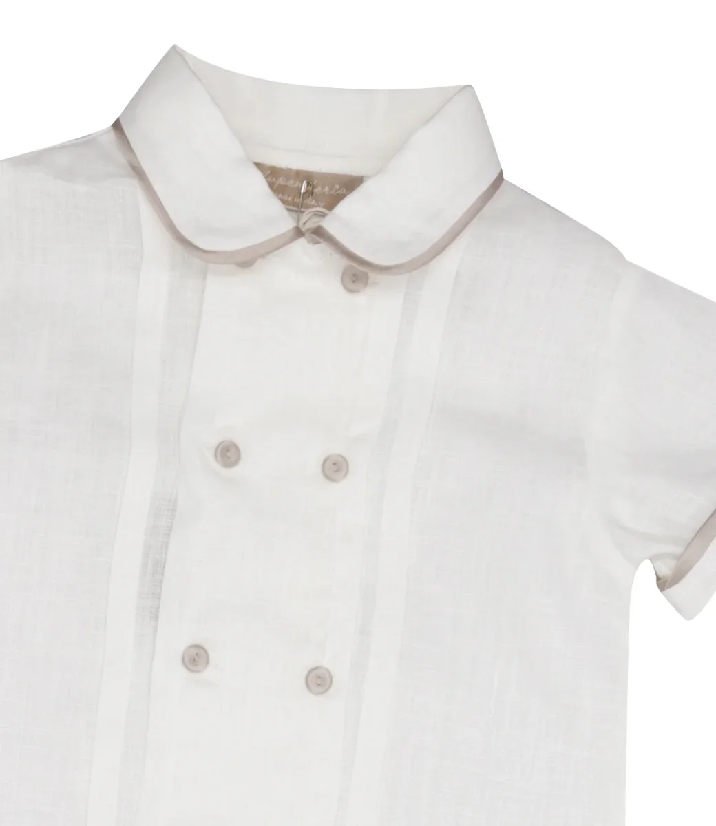 Set Camicia e Bermuda La Stupenderia, baby-lord per il body-camicia in puro lino bianco con pence, profili e bottoni ricoperti abbinati alla fusciacca in mikado di seta tortora, bermuda con spacchetti a righe e fodera in puro cotone