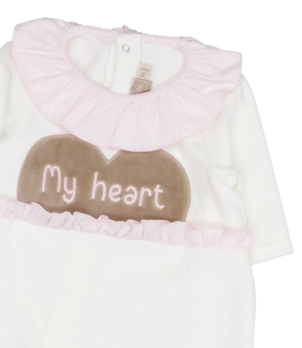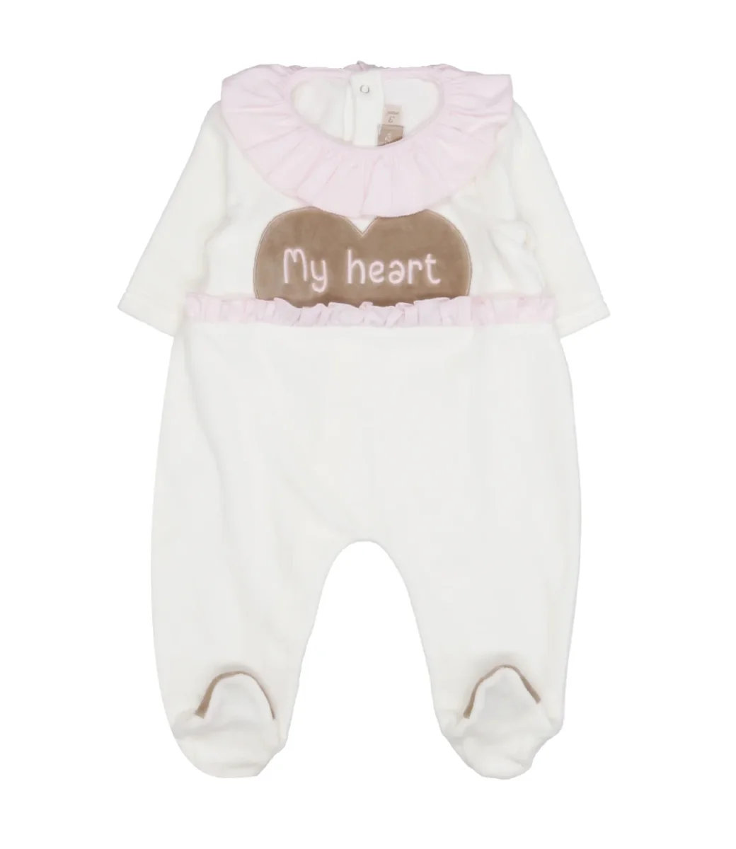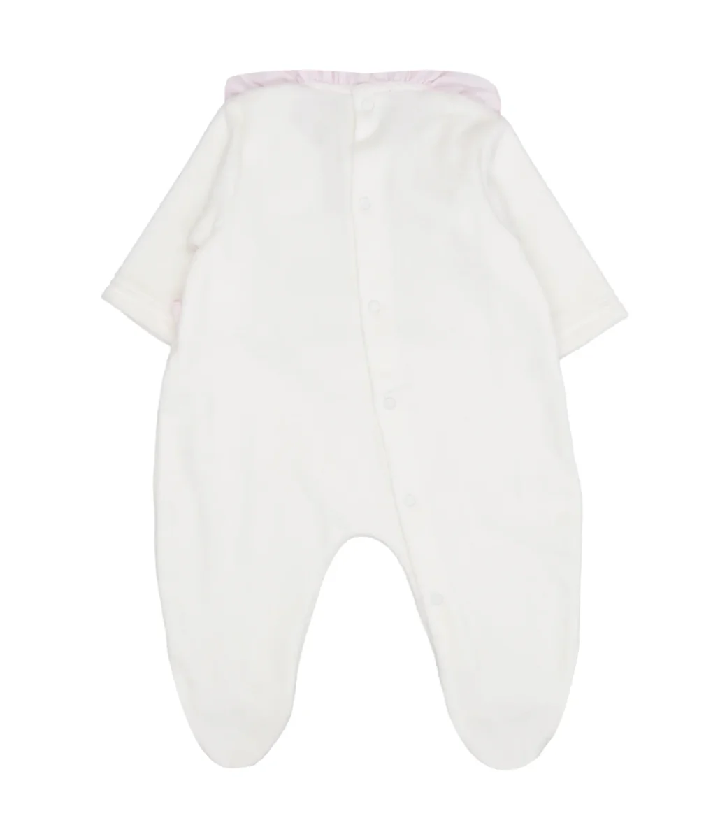 Tutina La Stupenderia bianca e rosa con colletto, ricamo sul petto e chiusura posteriore con bottoni.