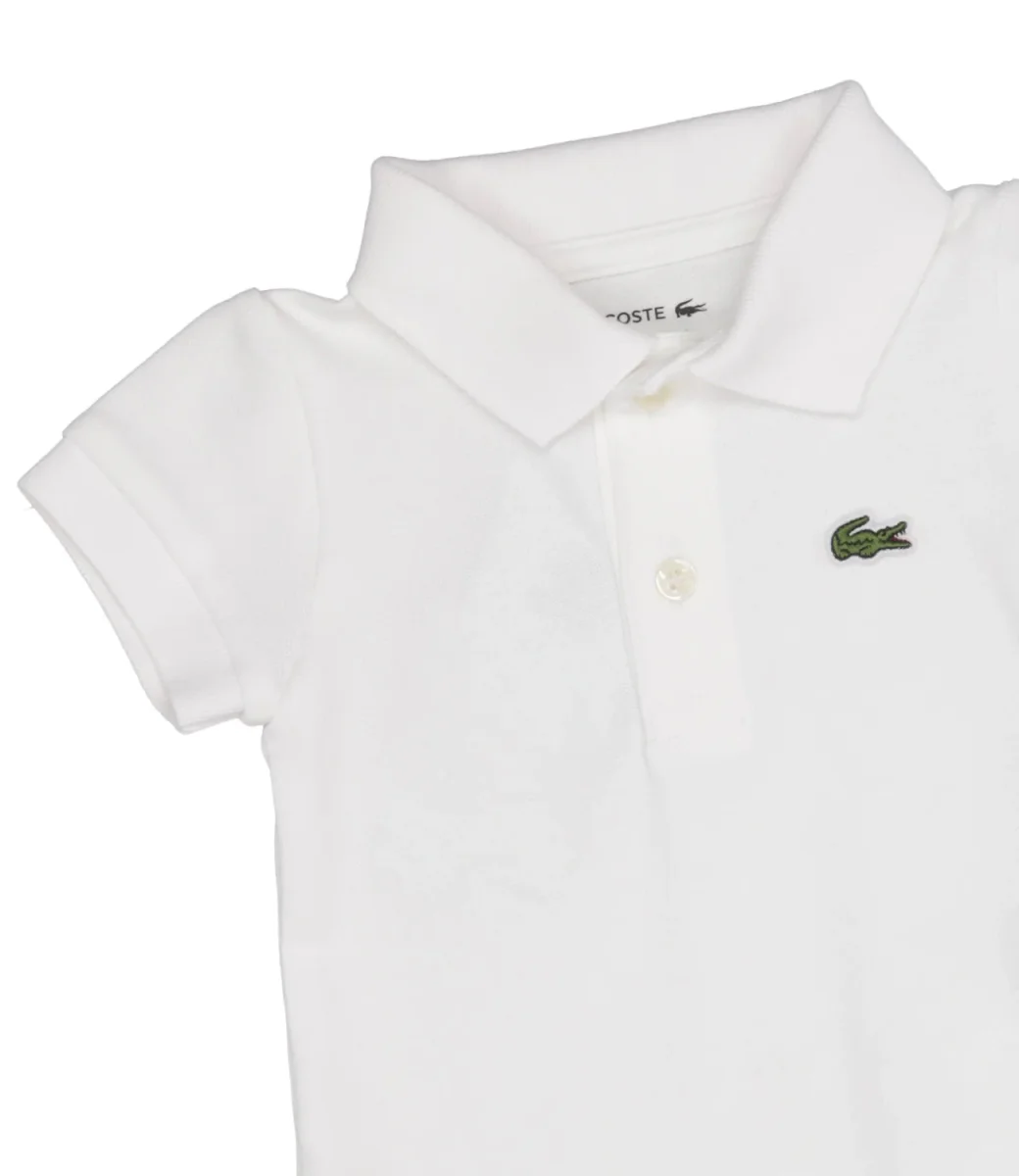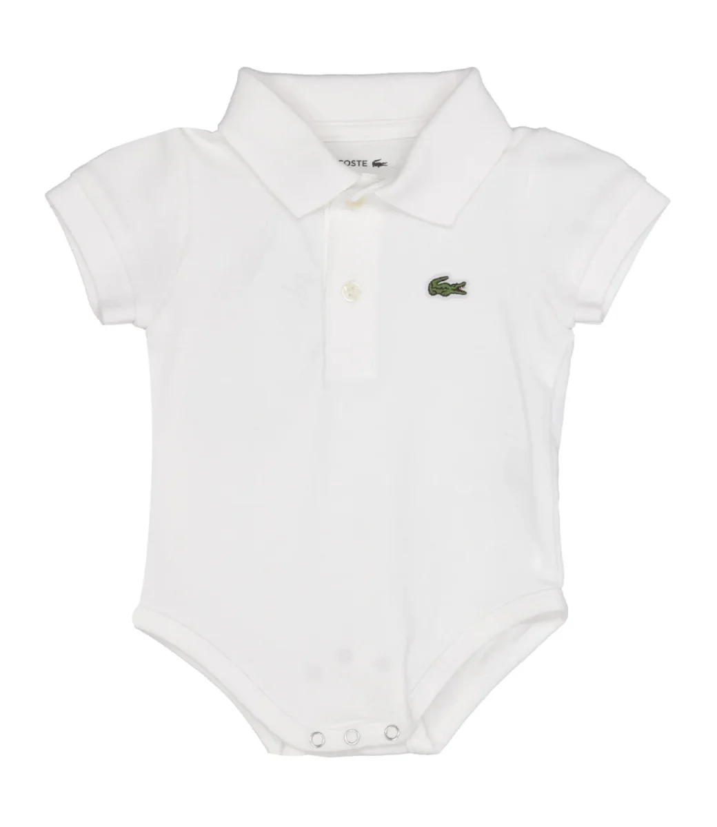 Body Lacoste Kids realizzato in cotone in motivo piqué elasticizzato, design della polo da uomo riprodotta a body con bottoni a pressione sul fondo per essere indossato dai piccolissimi. Iconico il coccodrillo verde sul petto per lo stile del brand.