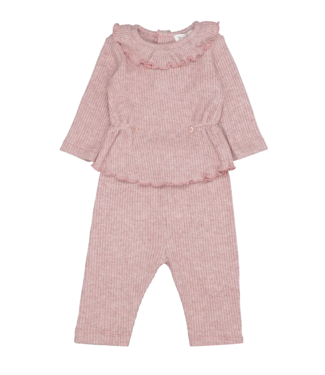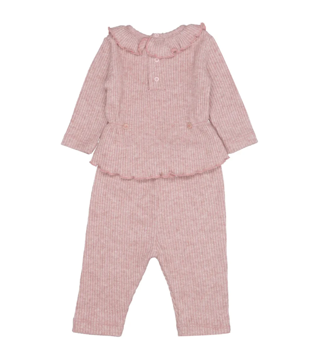 Set maglia e pantalone Lalalù in tessuto con motivo a coste, completo per le più piccole dalla linea ricercata, con colletto volant, vita sottolineata con arriccio, pasntalone con vita elasticizzata.