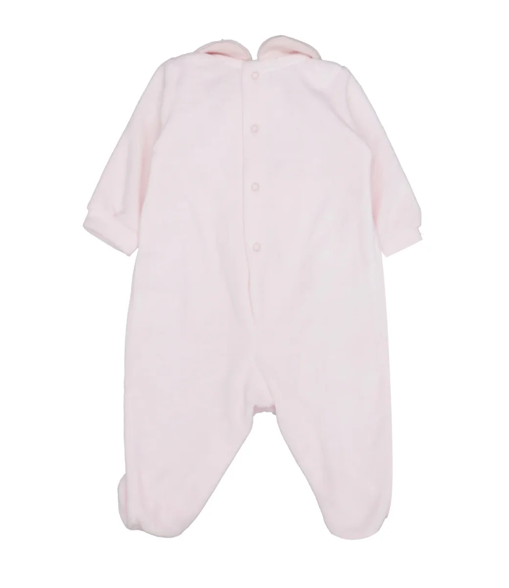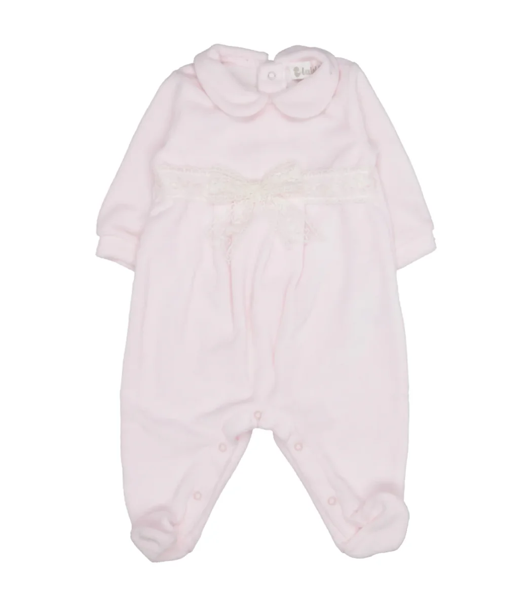 Tutina Lalalù in ciniglia di cotone, colletto club, cintura fissa in pizzo con fiocco sul davanti, chiusura con bottoni sul retro e sul fondo, maniche lunghe con polsini, fondo gamba con copripiede.