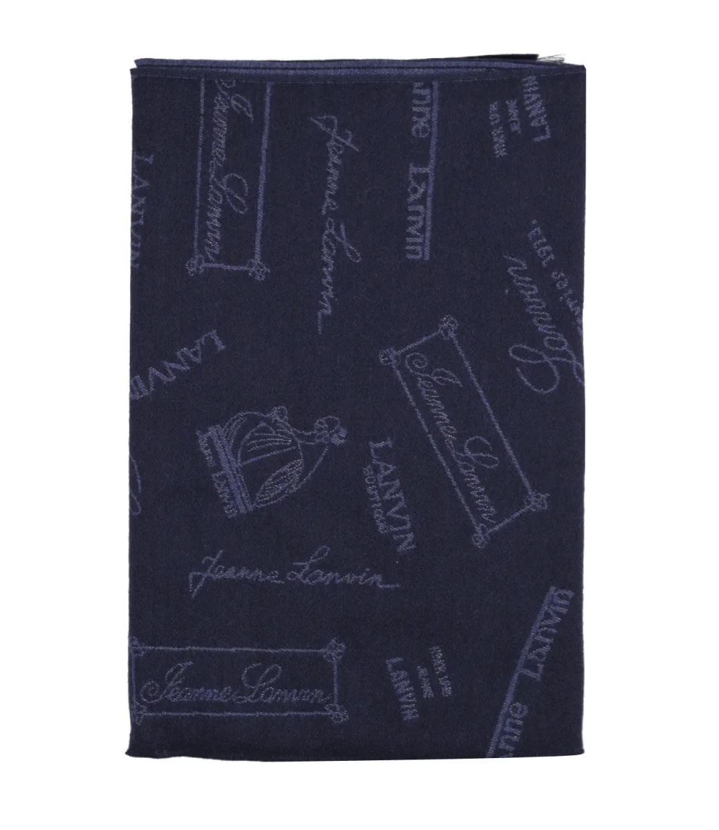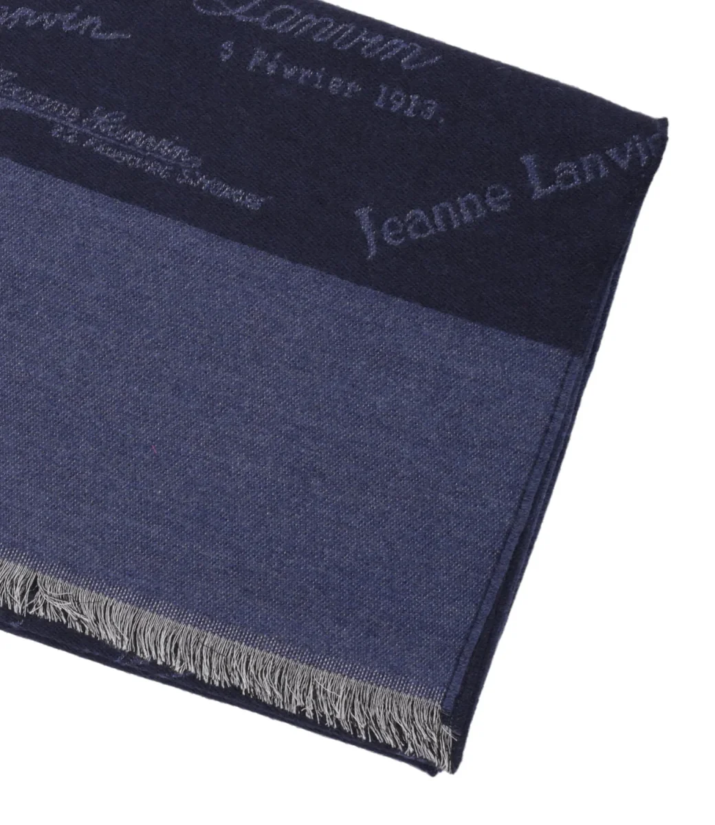 Sciarpa Lanvin in lana e seta blu con logo e motivo stampati e frange.