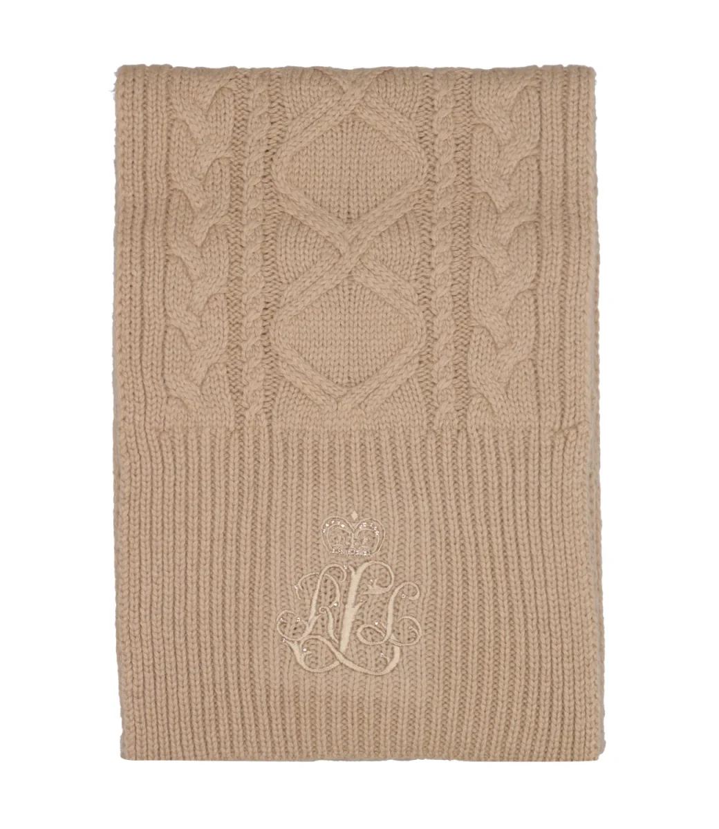Sciarpa Lauren Ralph Lauren realizzata in misto lana, morbida nel tessuto che presenta una lavorazione atrecce e coste sul bordo con esclusivo stemma in corsivo di Lauren.