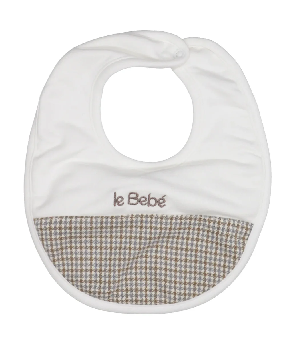 Bavaglino Le Bebè Enfant in cotone con logo lettering ricamato, inserto colorato con motivo pied de poule applicato sul davanti, chiusura sul retro del collo con bottoncino automatico, bordato con tessuto.