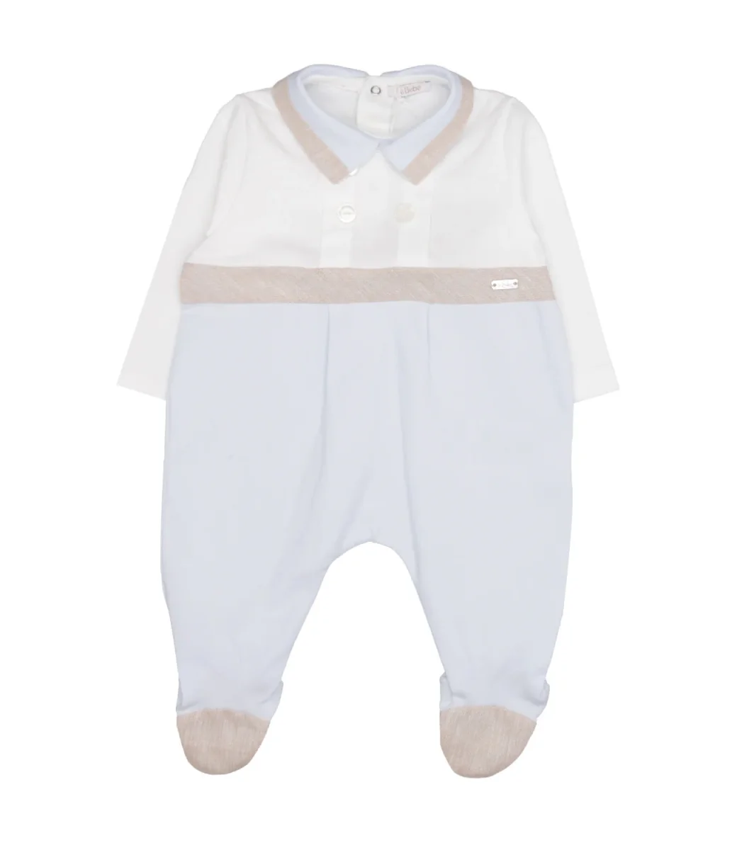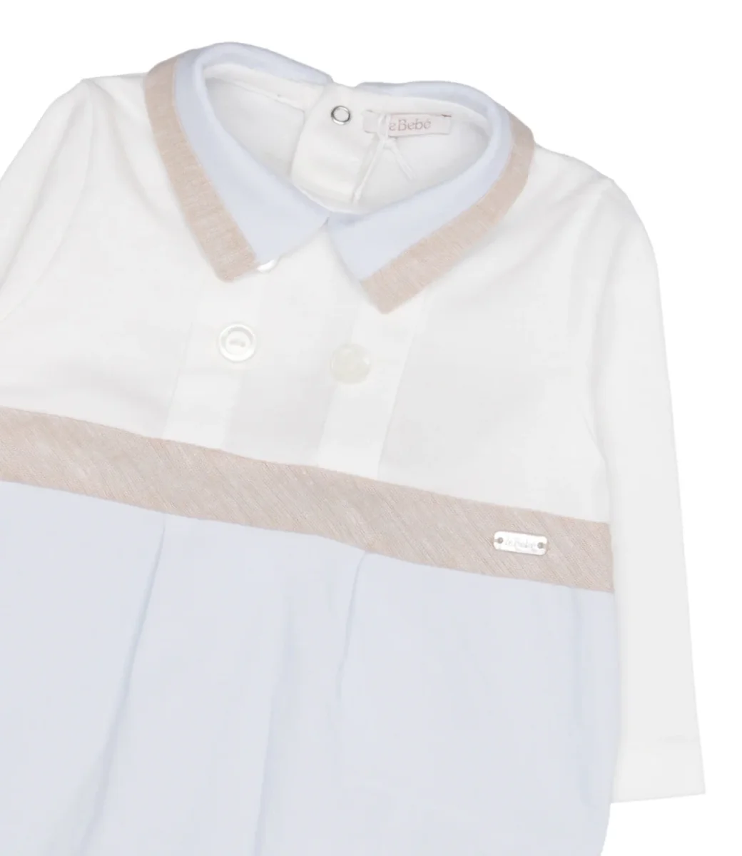 Tuta Le Bebè Enfant in misto cotone e lino, con colletto classico in tessuto, bottoni sul davanti maniche lunghei, gamba con copripiede, chiusura sul retro con bottoncini automatici.