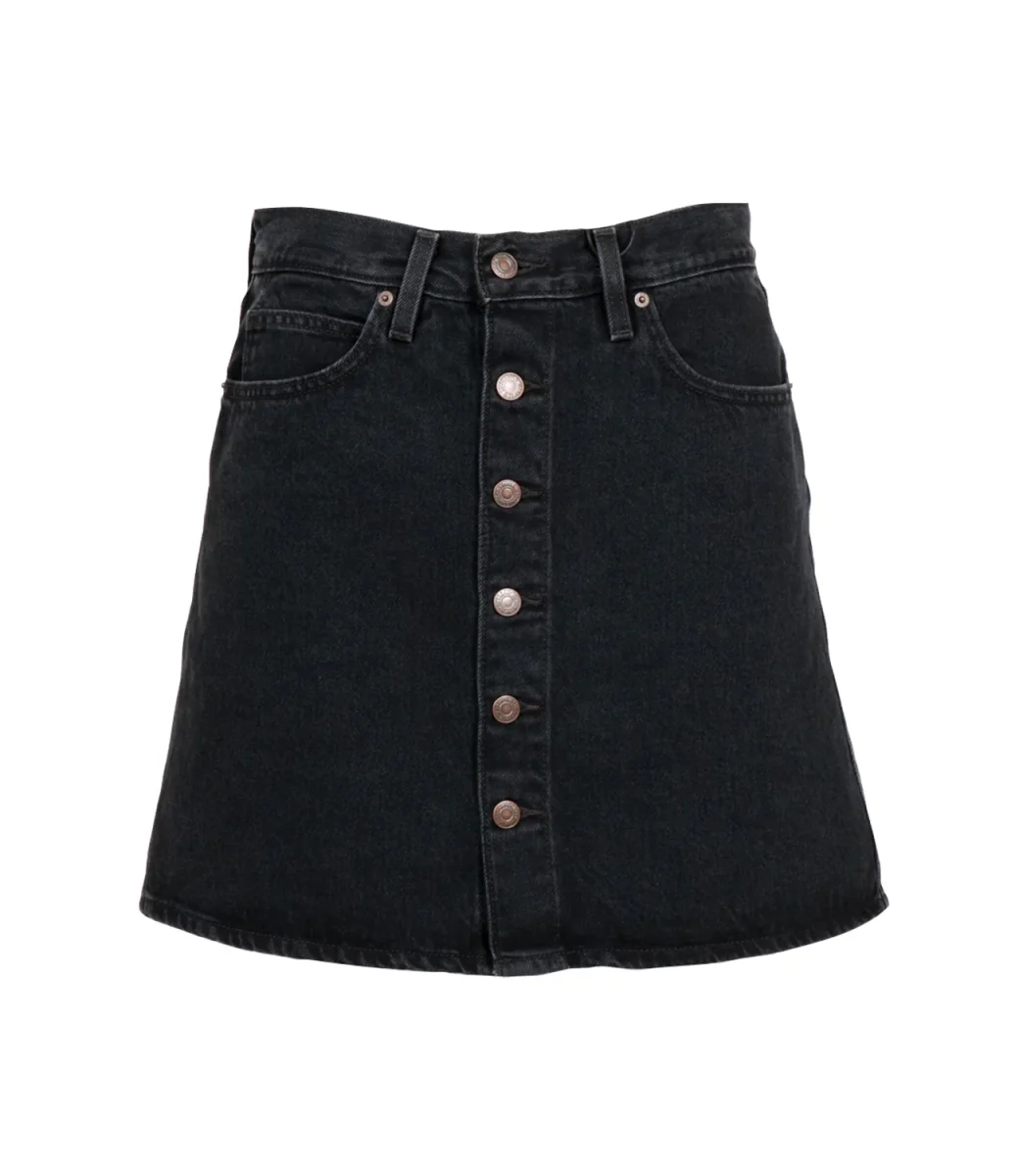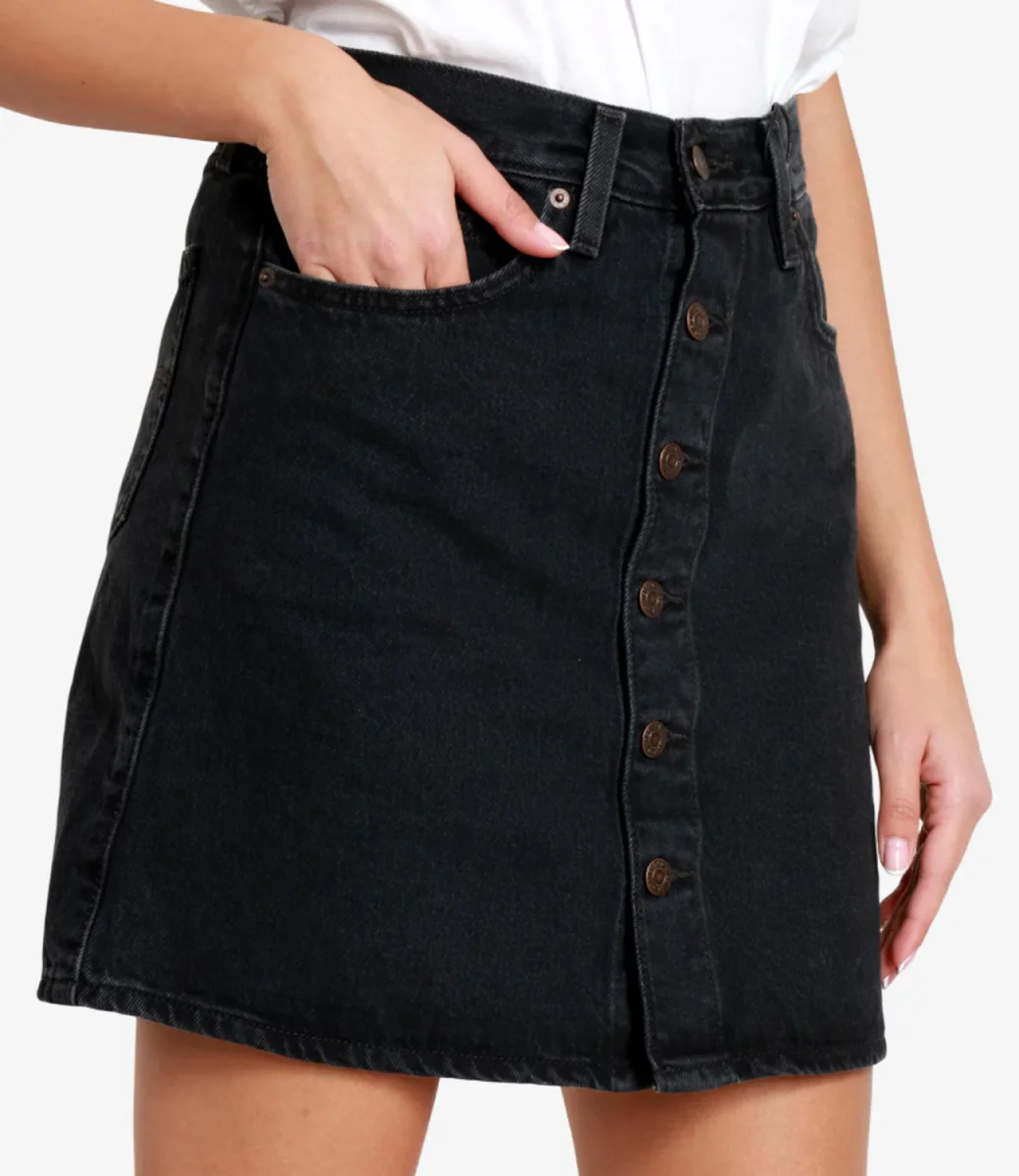 Gonna Levis Retro Button Front Skirt in denim. Vita regolare, comoda sui fianchi, bottoni su tutta la lunghezza davanti, inconfondibile toppa in pelle personalizzata Levi’s sul retro della vita.