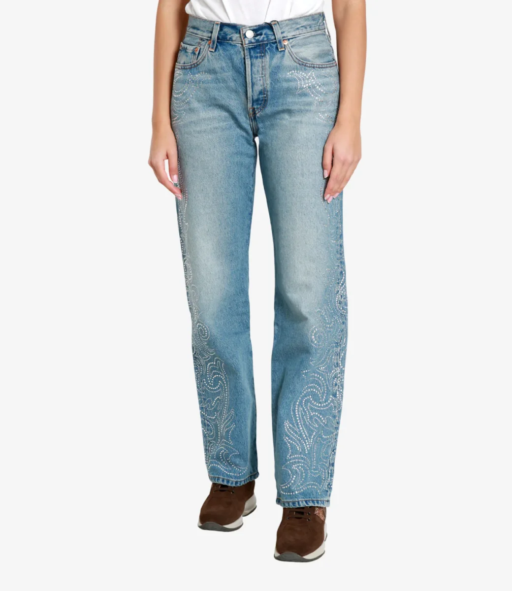 Jeans Levis 501® ’90S in denim di cotone non elasticizzato, modello 5 taschestile anni ’90 con vita media, taglio dritto e ampio e gamba oversize. Decoro sul laterale per l’intera lunghezza Western Crystal.