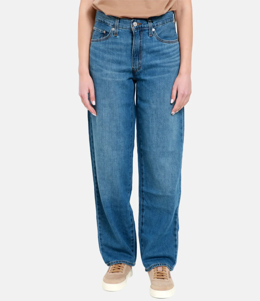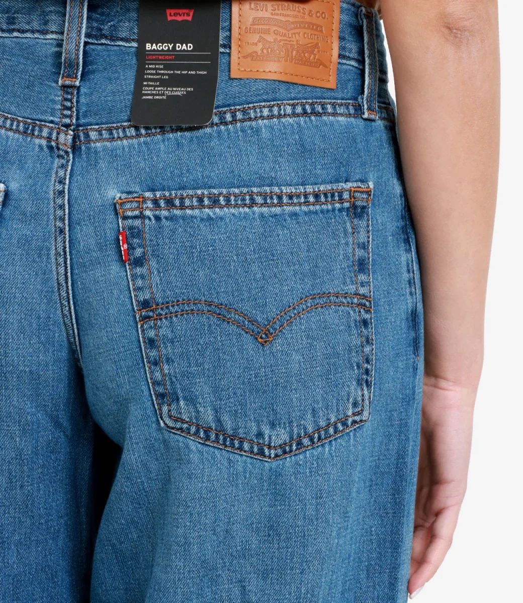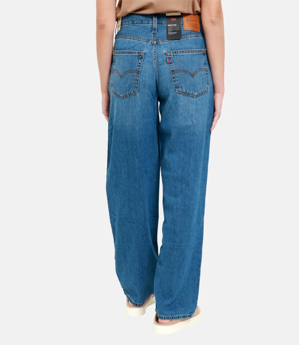 Jeans Levis Baggy Dad in denim, modello cinque tasche, vita media con passanti e Levi strauss label sul retro, chiusura con zip con patta e bottone in metallo personalizzato, red label applicato al bordo della tasca sul retro, gamba ampia, silhouette morbida su fianchi e cosce che stringe alla caviglia, orlo dritto.