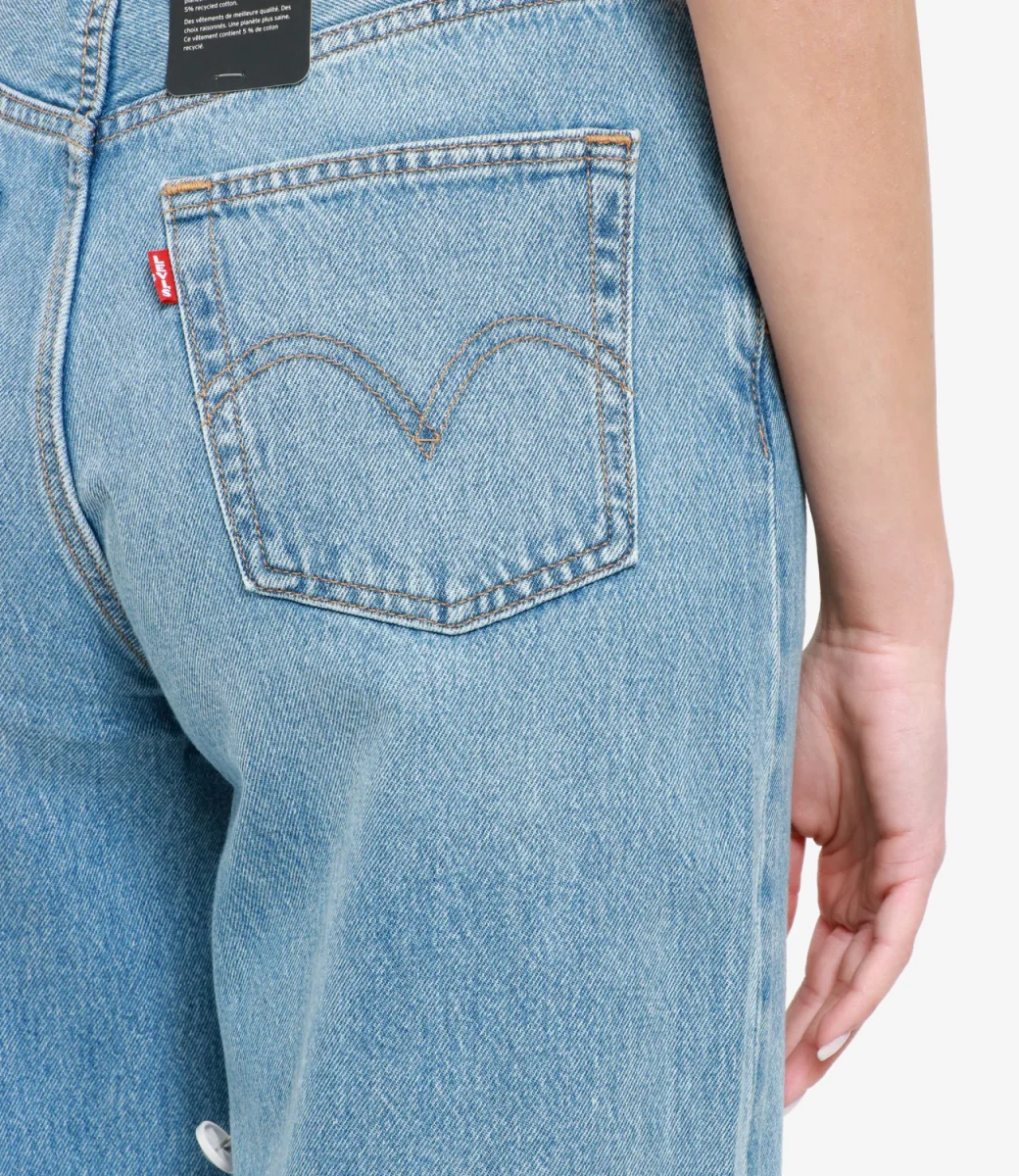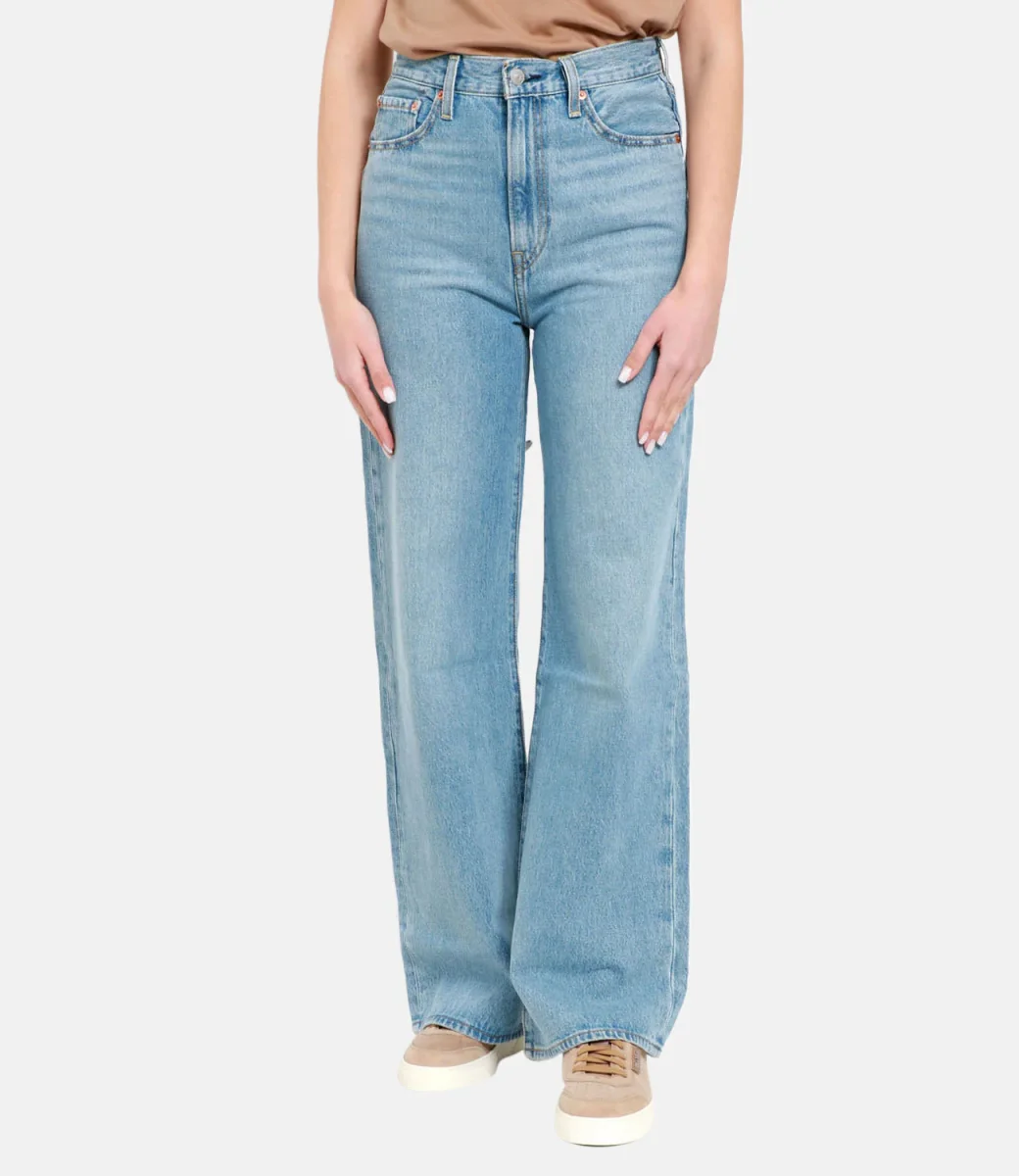 Jeans Levis modello Ribcage Wide Leg in denim dal look anni ’70 con vita molto alta per dare risalto alla piena femminilità donando una silhouette slanciata insieme ad una ampia gamba che scende dritta.