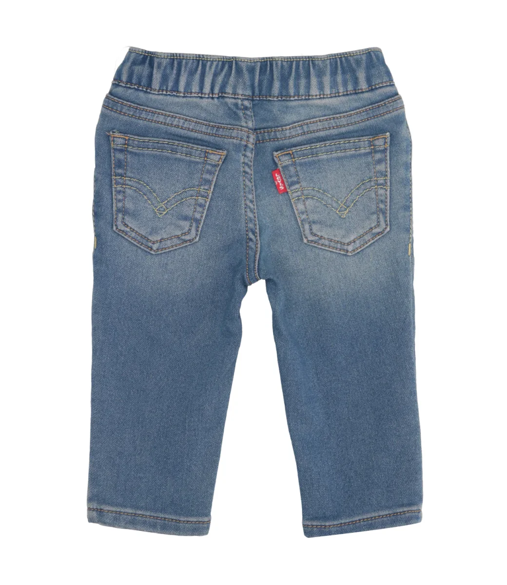 Jeans Levis Kids in denim di cotone, elasticizzato, lavaggio effetto used, vita elasticizzata, modello skinny, tasche all’americana sul davanti, tasche applicate sul retro con iconico logo patch Levi’s, impunture gialle.