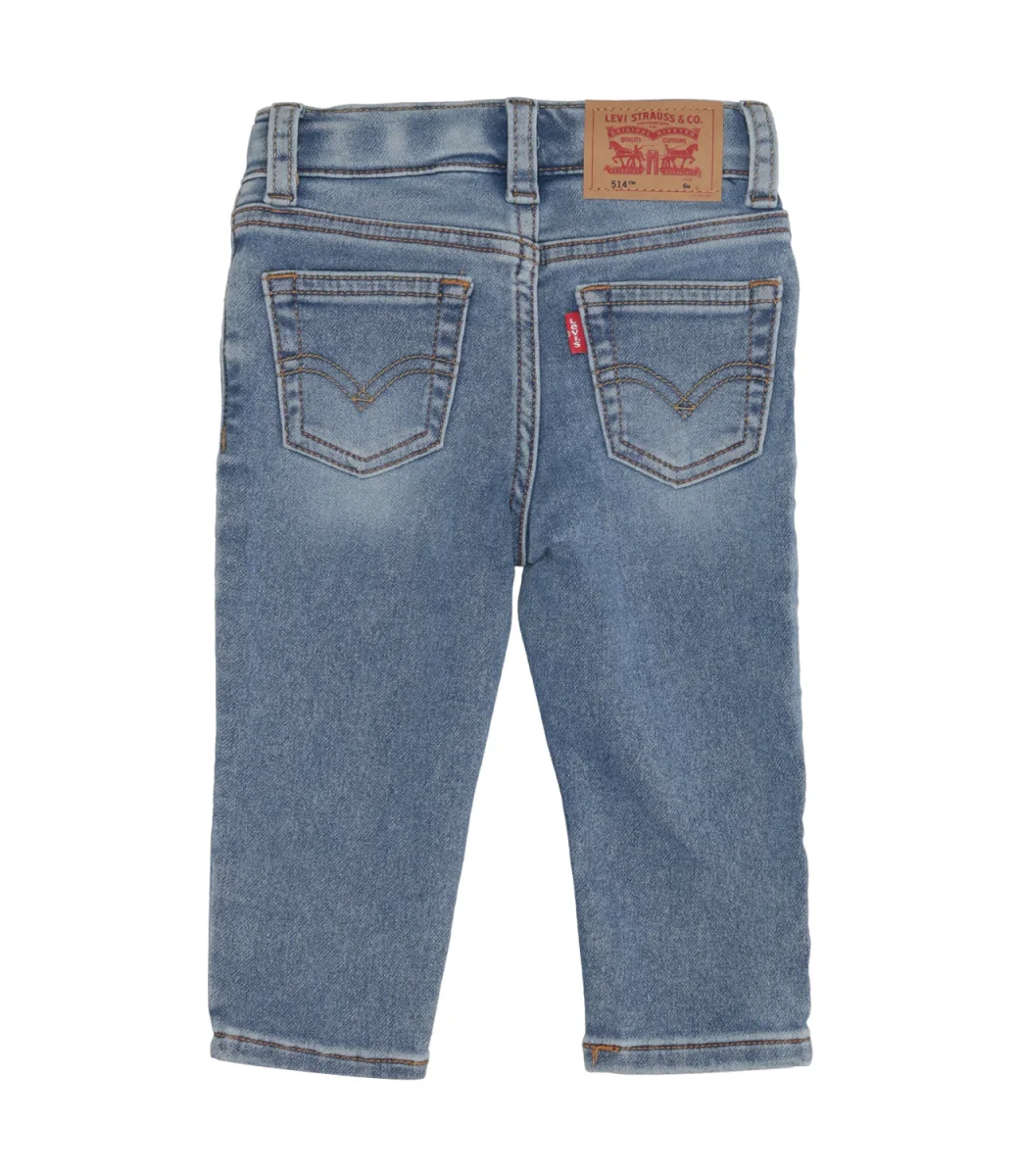 Jeans Levis Kids in denim di cotone, elasticizzato, lavaggio effetto used, vita elasticizzata, modello skinny, tasche all’americana sul davanti, tasche applicate sul retro con iconico logo patch Levi’s, impunture gialle.