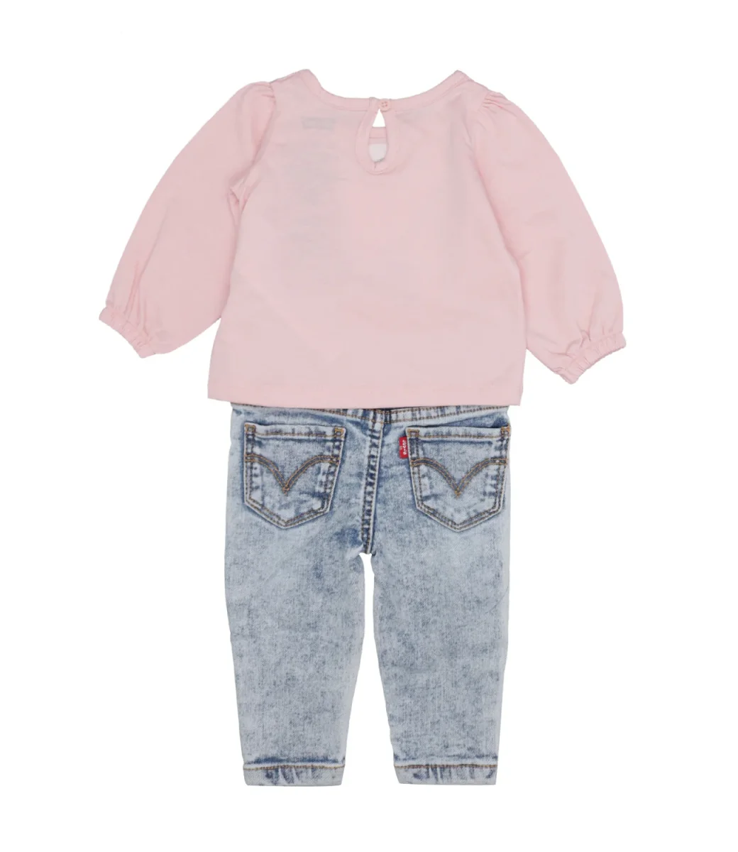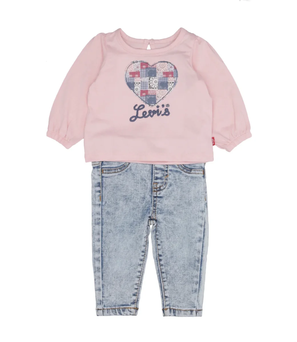 Set T-Shirt e Pantalone Levis Kids in cotone. Felpa con girocollo, stampa maxi sul davanti, maniche lunghe con polsini elastici. Pantalone in denim chiaro used con vita regolare con passanti, modello cinque tasche, etichetta logata sulla tasca