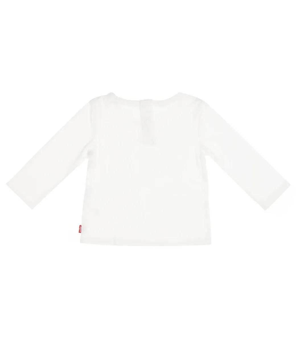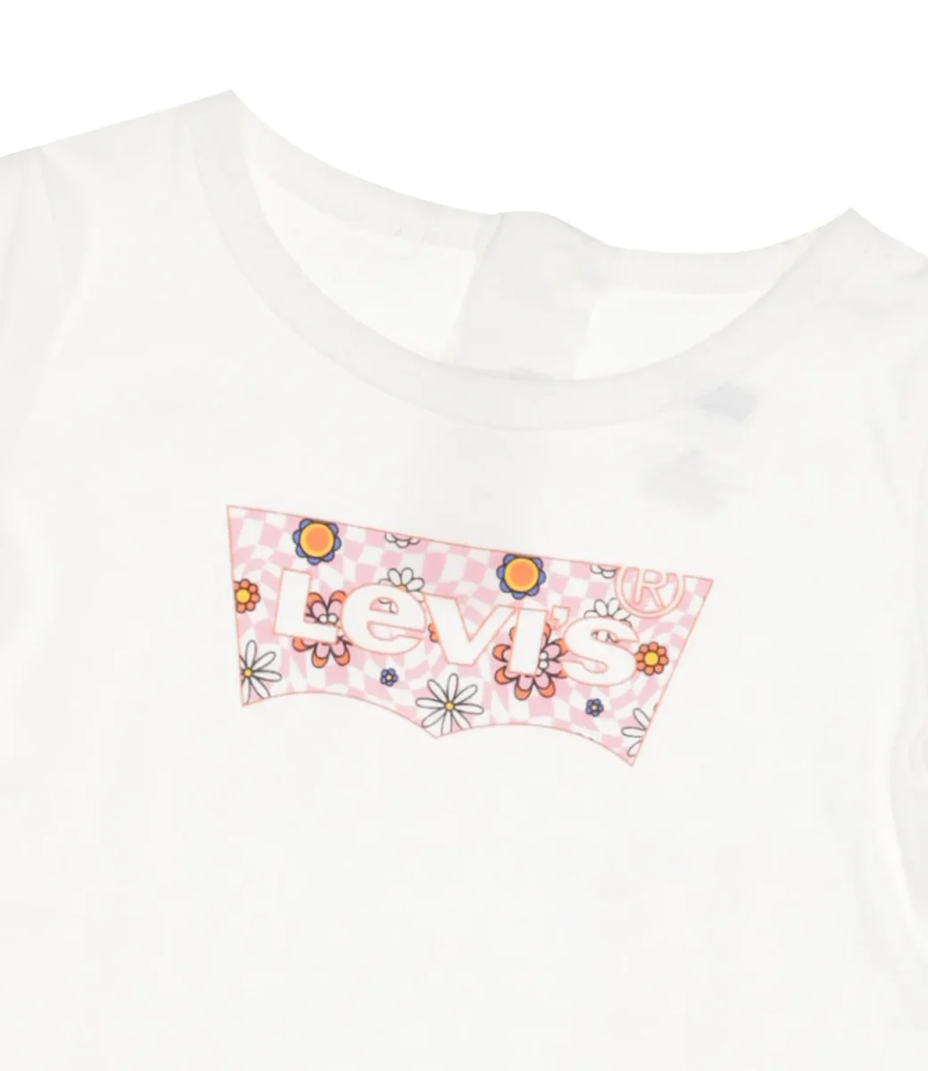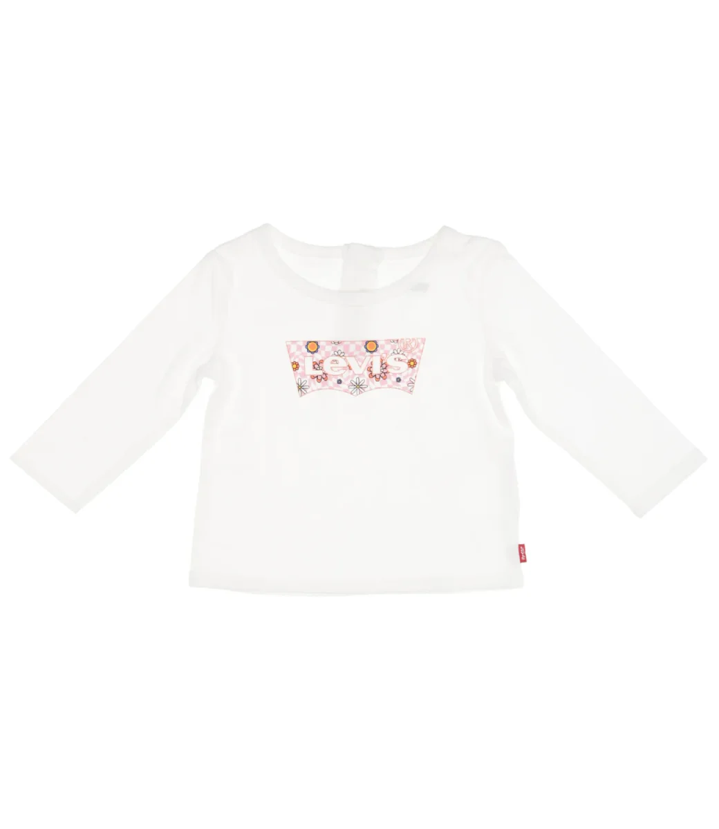 T-Shirt Levis Kids in cotone bianco, con iconico logo Batwing del marchio stampato a fantasia fiorata sul davanti, girocollo ampio, maniche lunghe, orlo dritto, etichetta patch logo sul laterale, chiusura sul retro con bottoncini automatici in tono, vestibilità regolare.