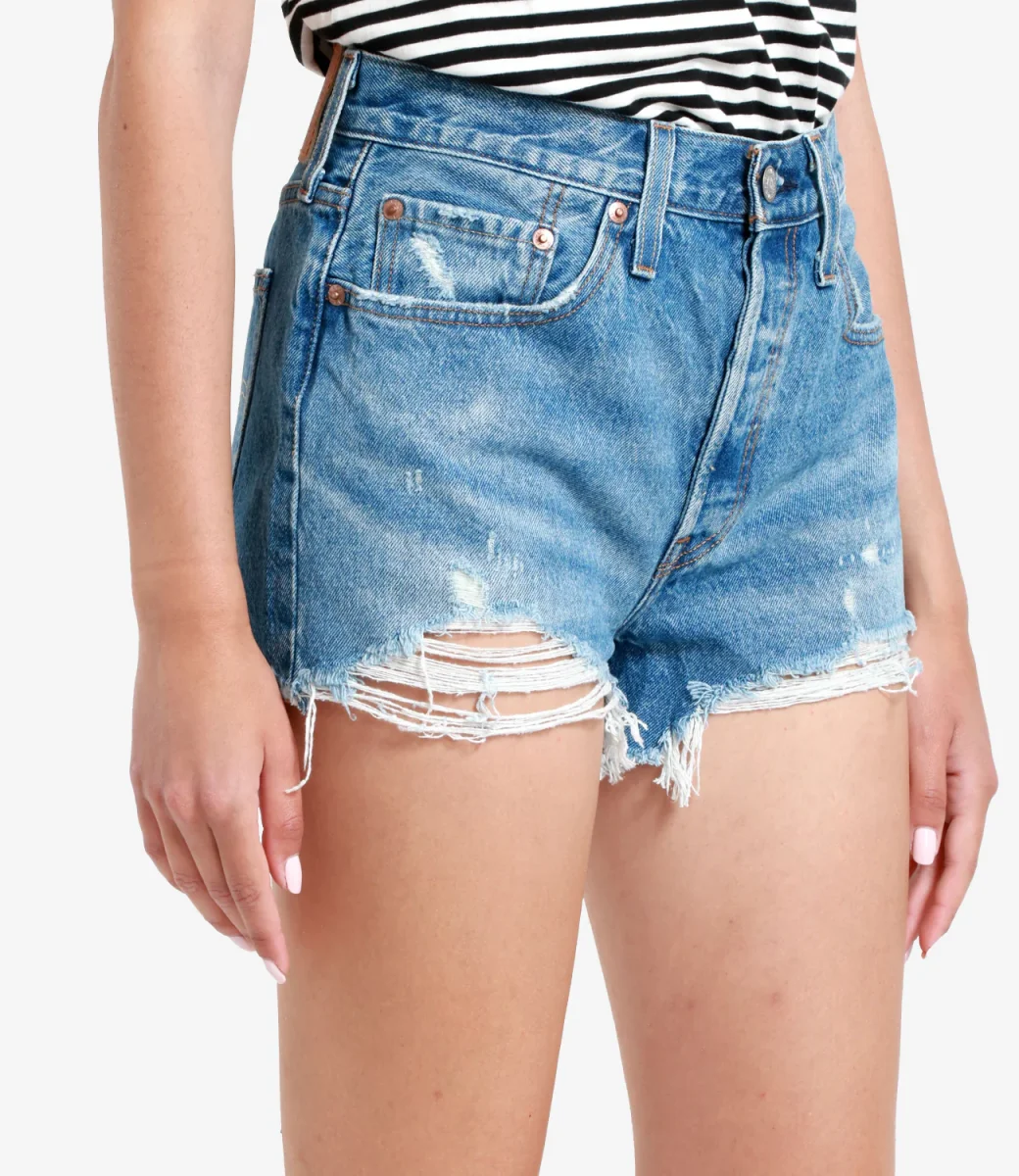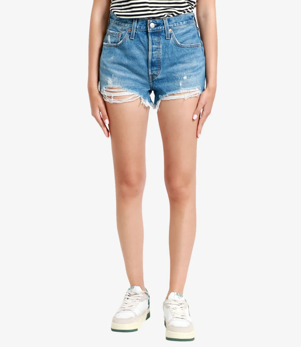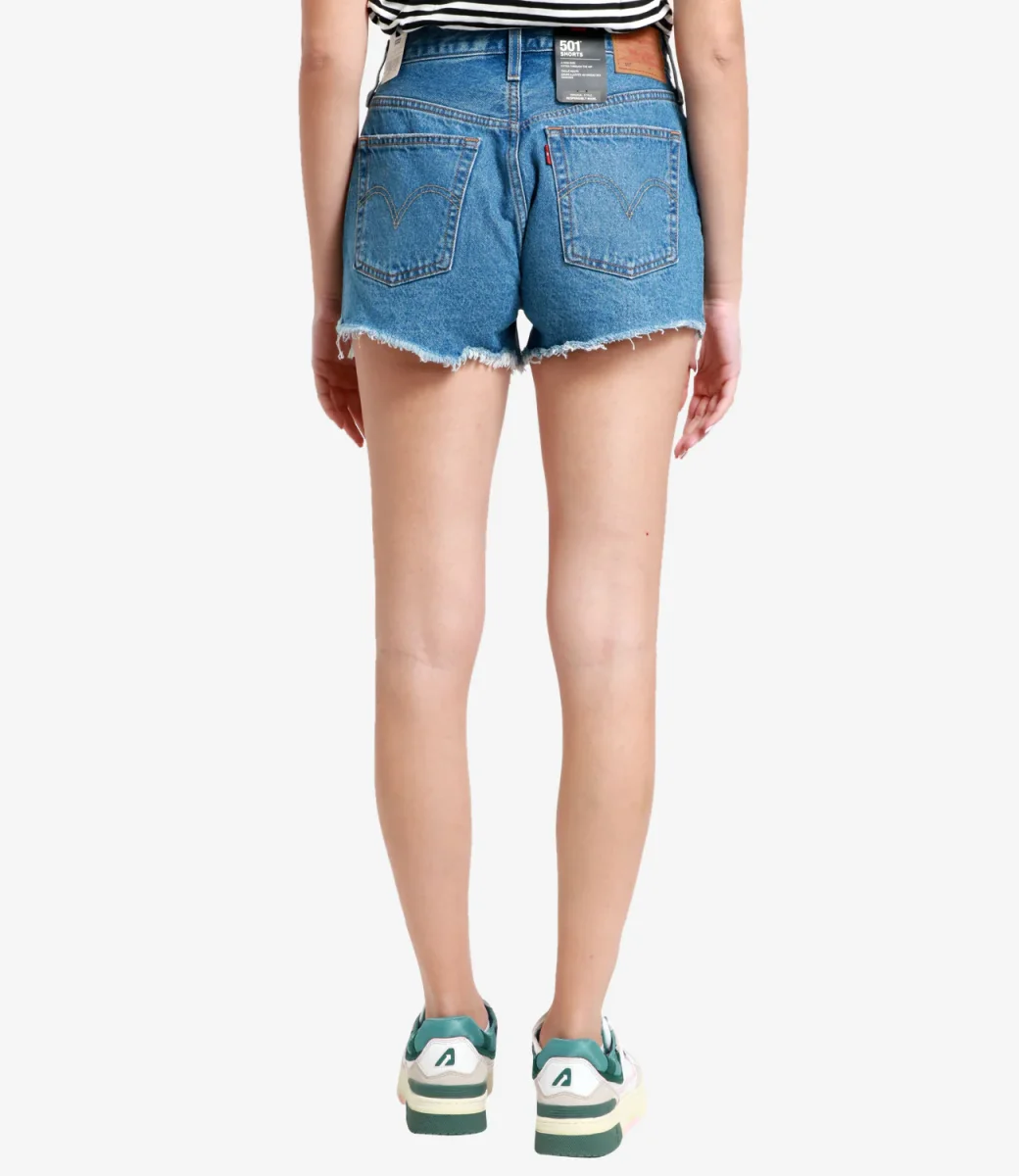 Shorts Levis 501 Original in denim medio, modello corto, super vintage con il caratteristico orlo “masticato” proprio e inconfondibile nota di questo capo.
