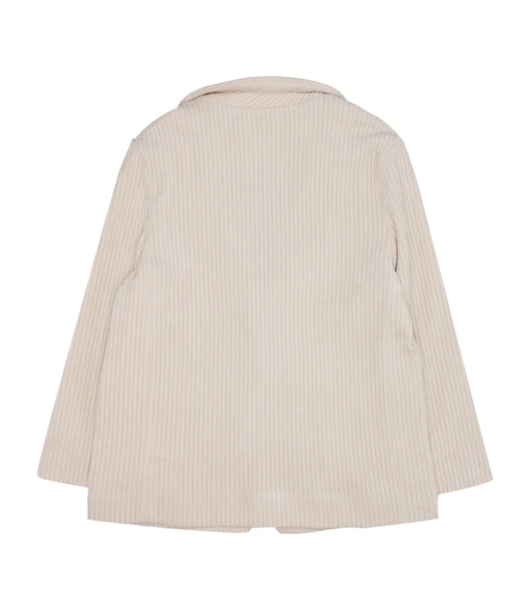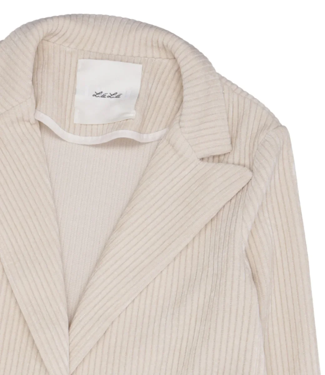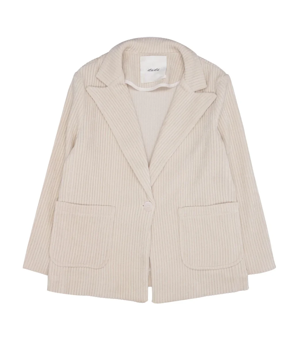 Giacca Lu Lu Girl realizzato in caldo tessuto velur a coste larghe, scollo con rever stretto a punta, modello monopetto, tasche applicate sul davanti, maniche lunghe, fondo dritto.