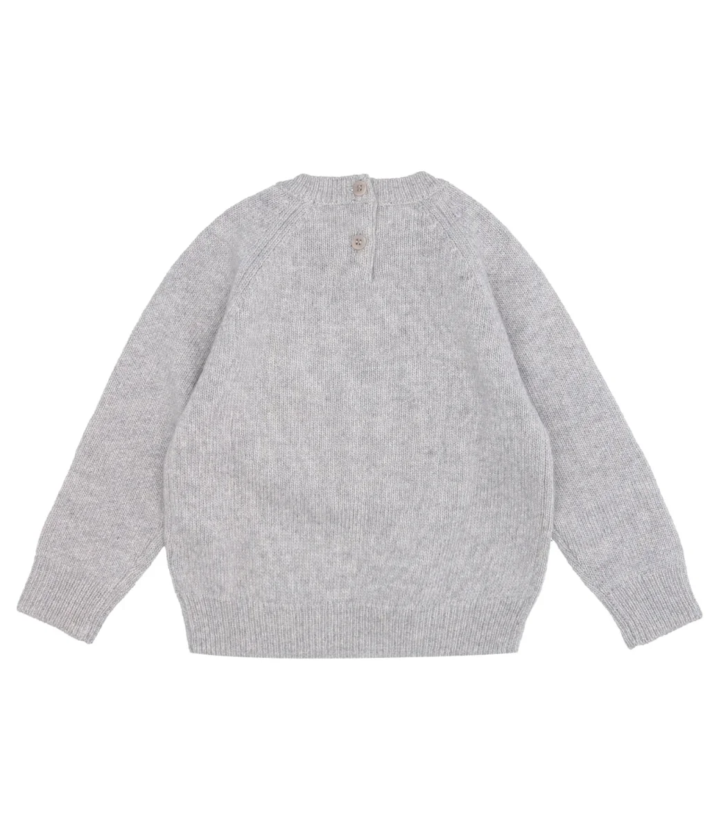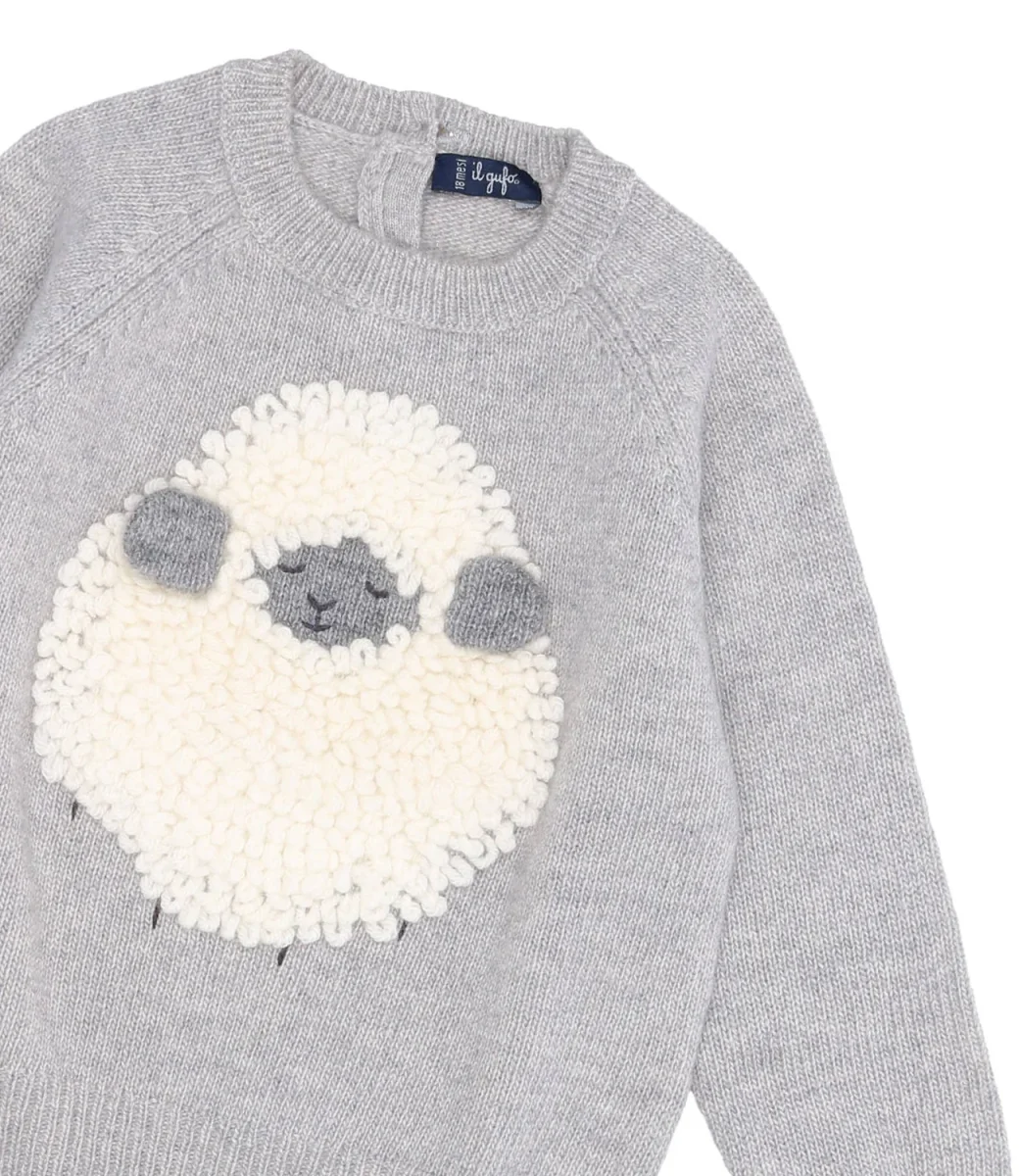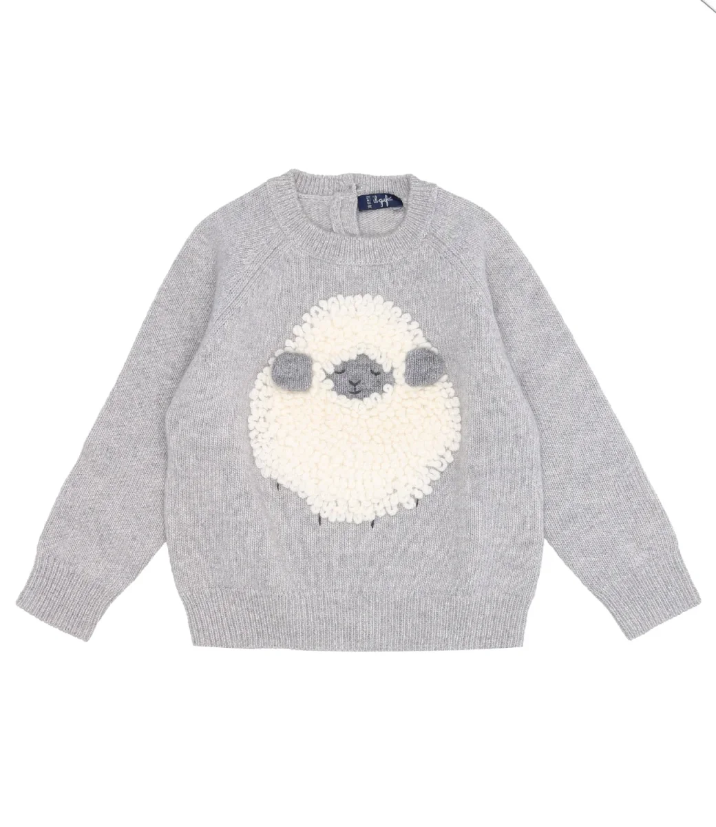 Maglia Il Gufo in lana merinos nube, girocollo, pecorella bianca intarsiata e ricamata a mano in punto pelliccia sulla parte anteriore, chiusura posteriore a due bottoni, maniche lunghe, orlo e polsini a coste.