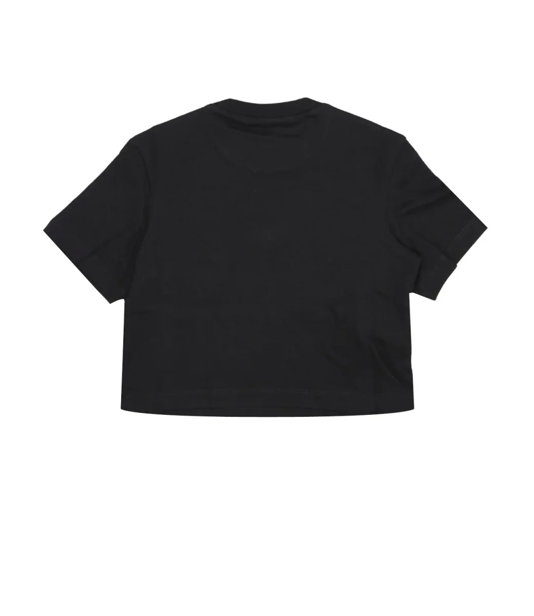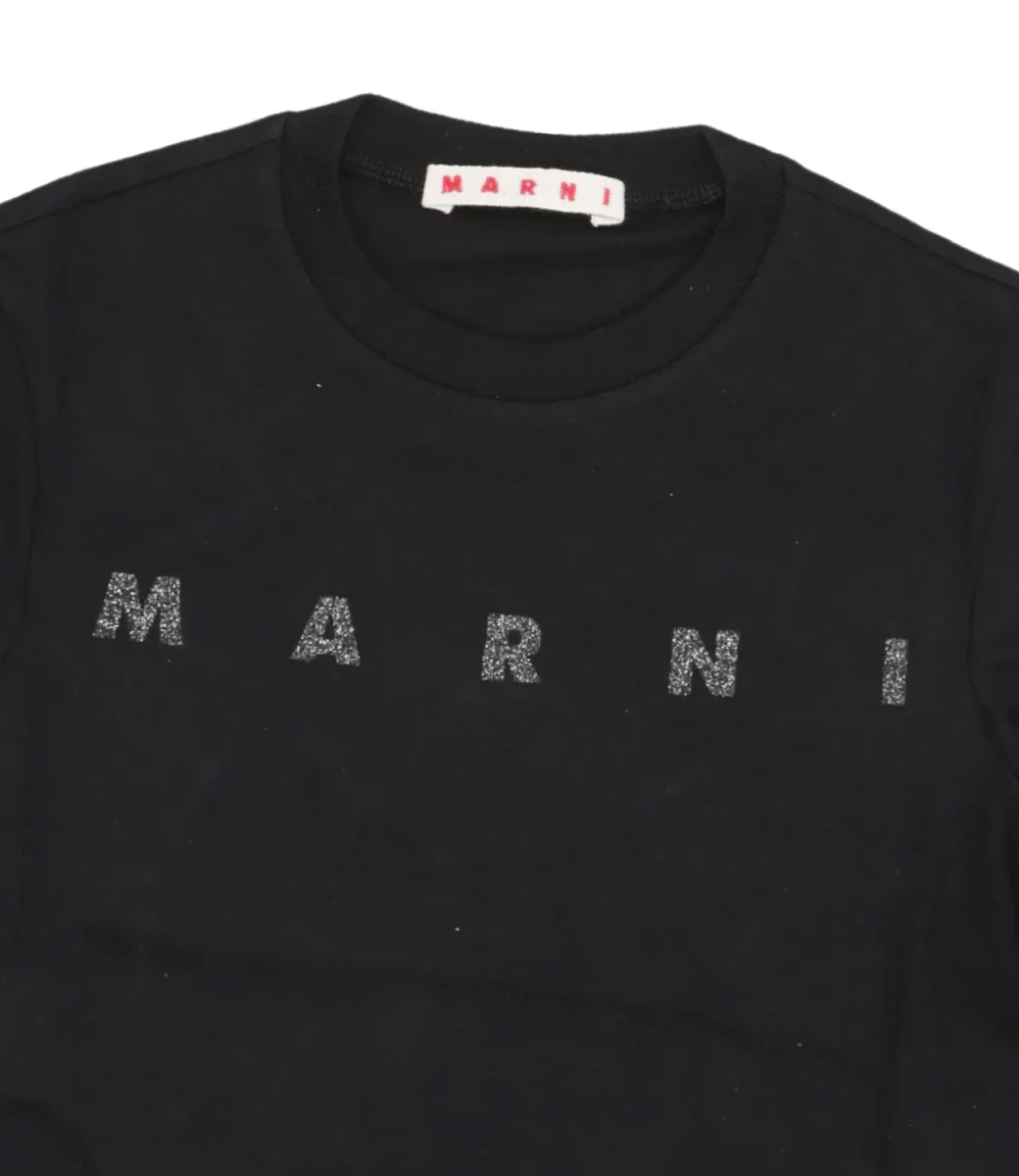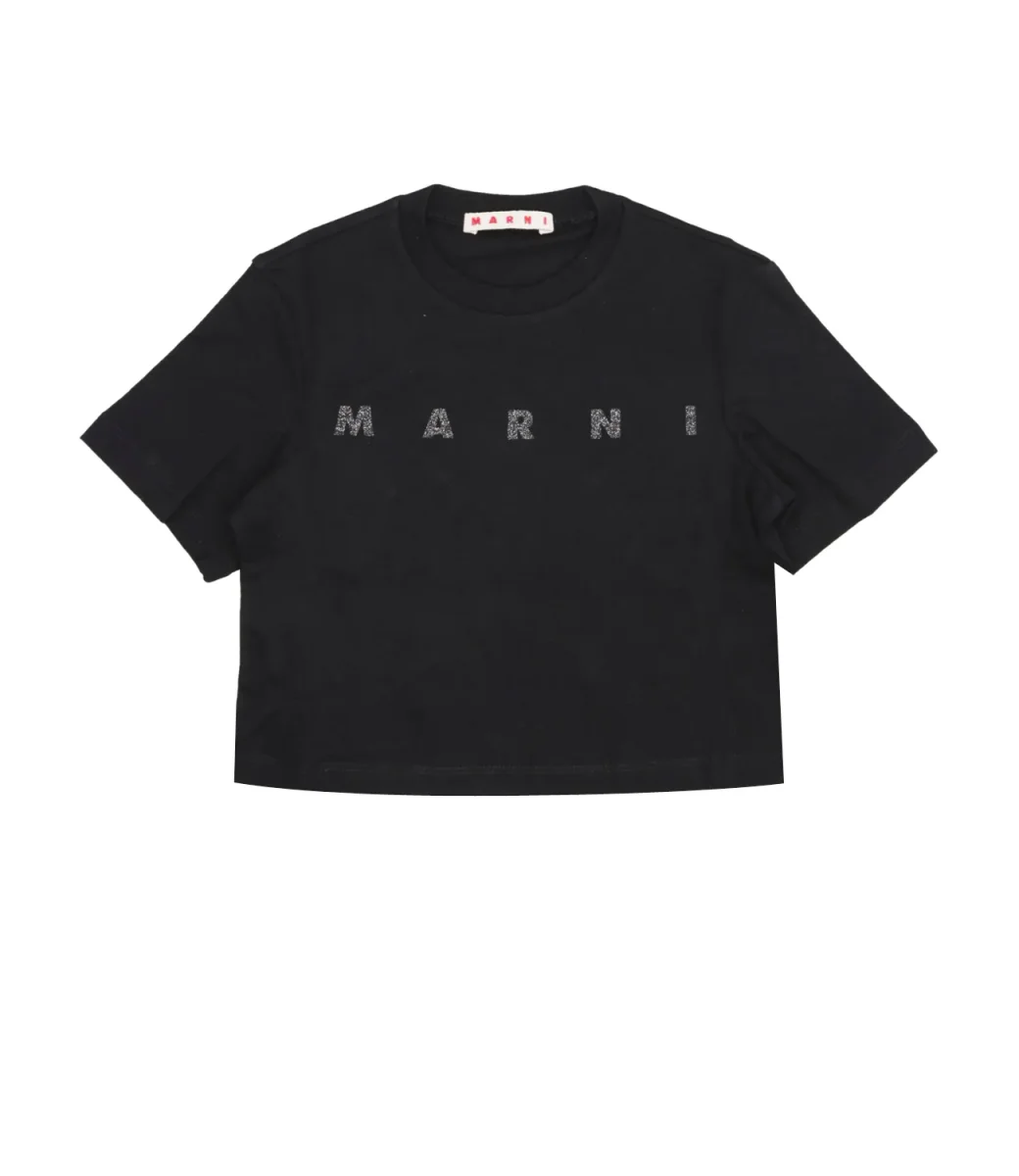 T-Shirt Marni Kids in cotone nero a girocollo con logo frontale e mezze maniche.