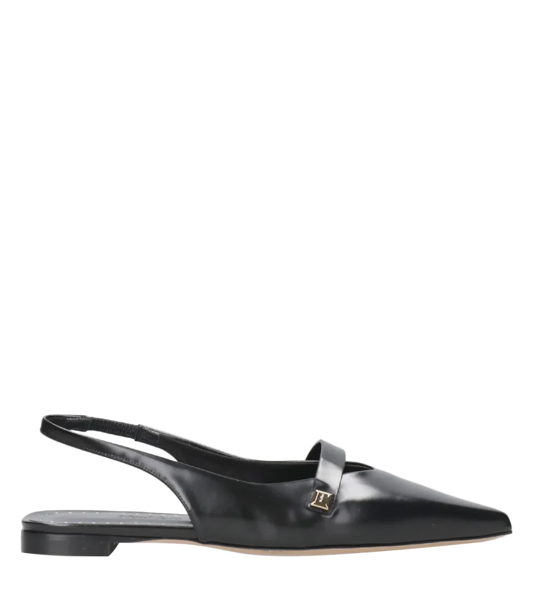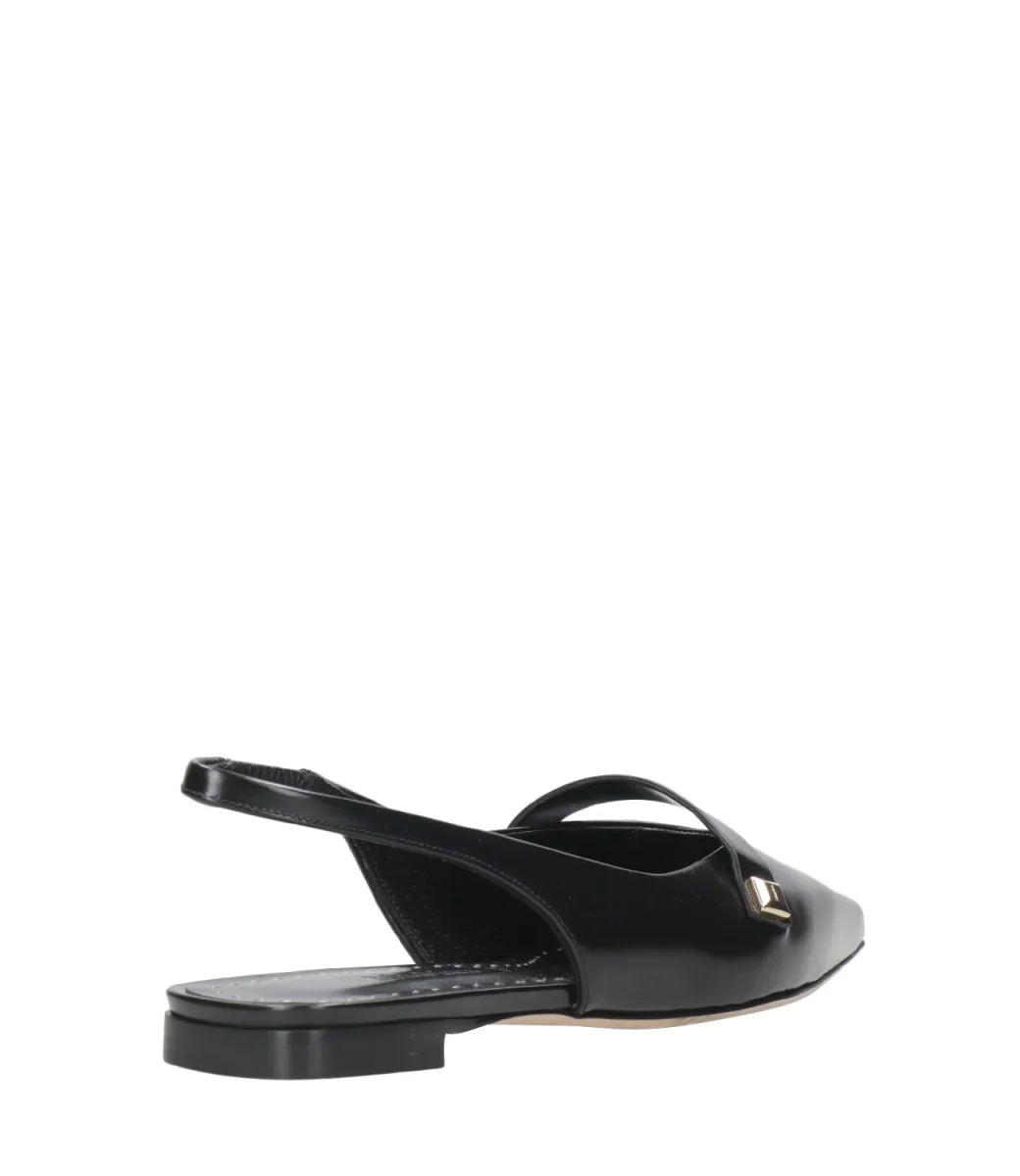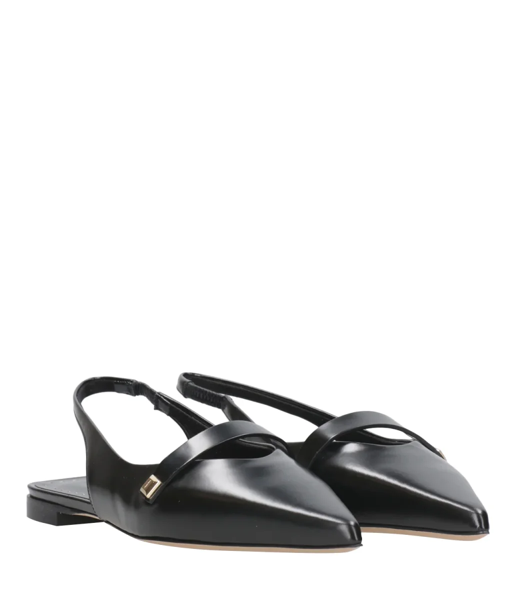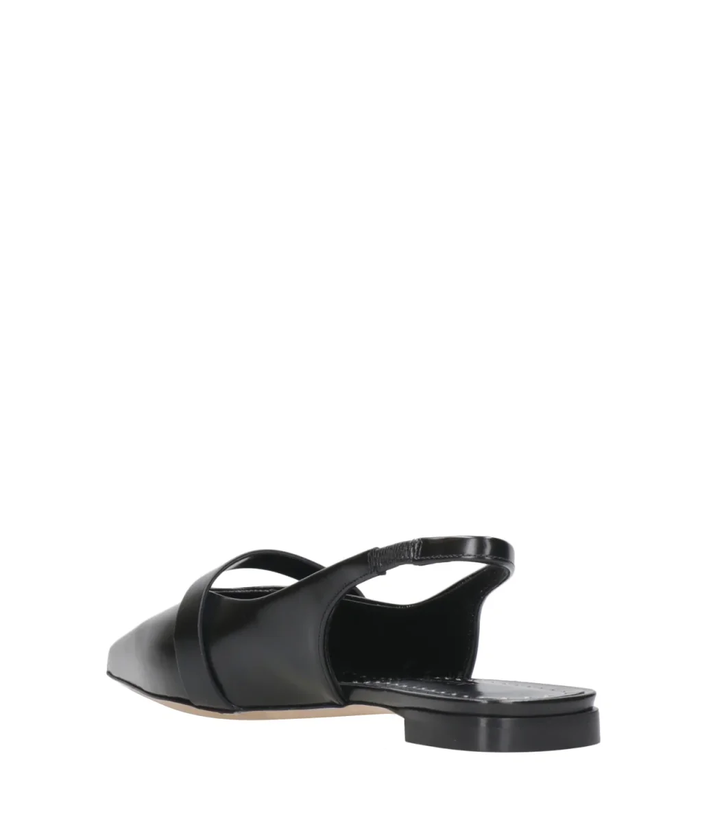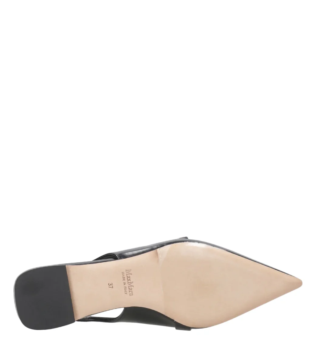 Ballerina Max Mara modello MMspring in pelle con cinturino elastico a sostenere il tallone, cinturino sul collo del piede con fibbia con logo inciso e suola in cuoio.