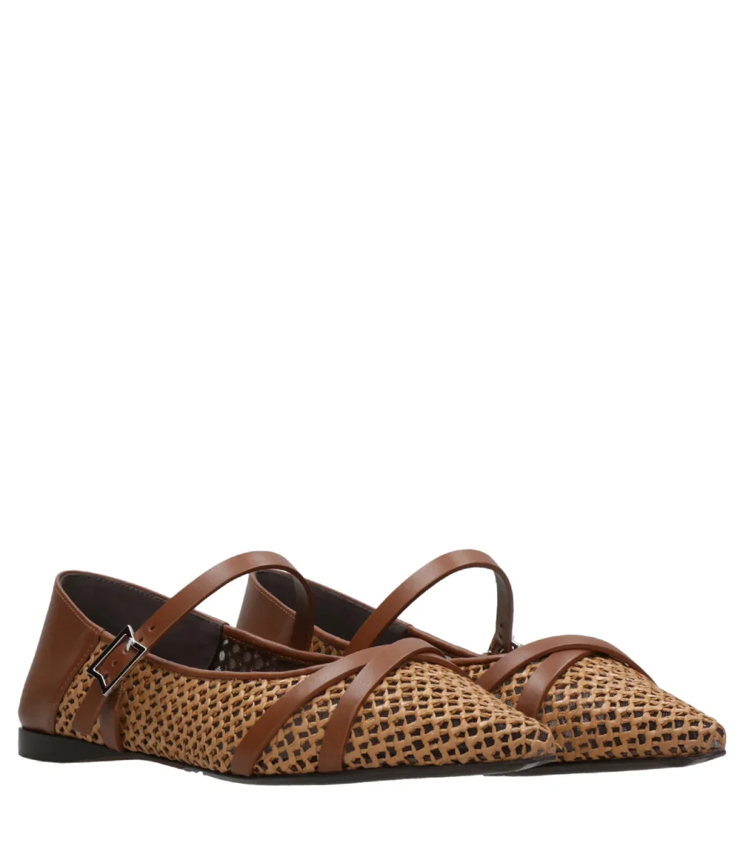 Ballerina Max Mara Woven design Flat pointy toe realizzate in tessuto crochet con dettagli in morbida pelle di vitello con una finitura semilucida effetto maltinto. Chiusura con cinturino con fibbia in metallo sul collo del piede, cinturini fissi ad incrocio in punta. Tallone in pelle ripiegabile verso l’interno per una portabilità a sabot. Fodera in nappa e suola in cuoio.