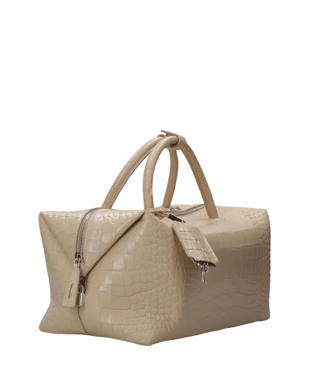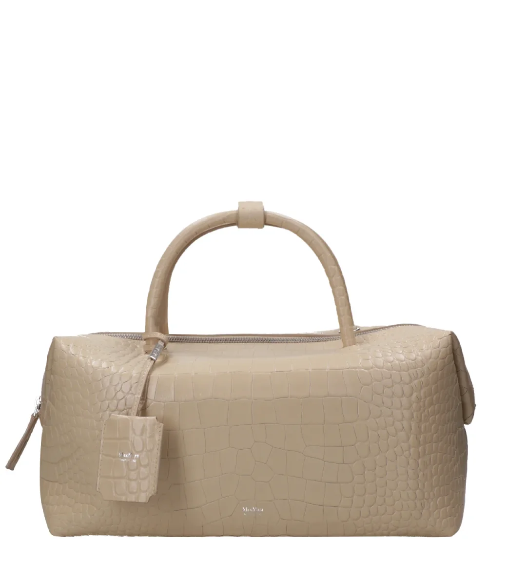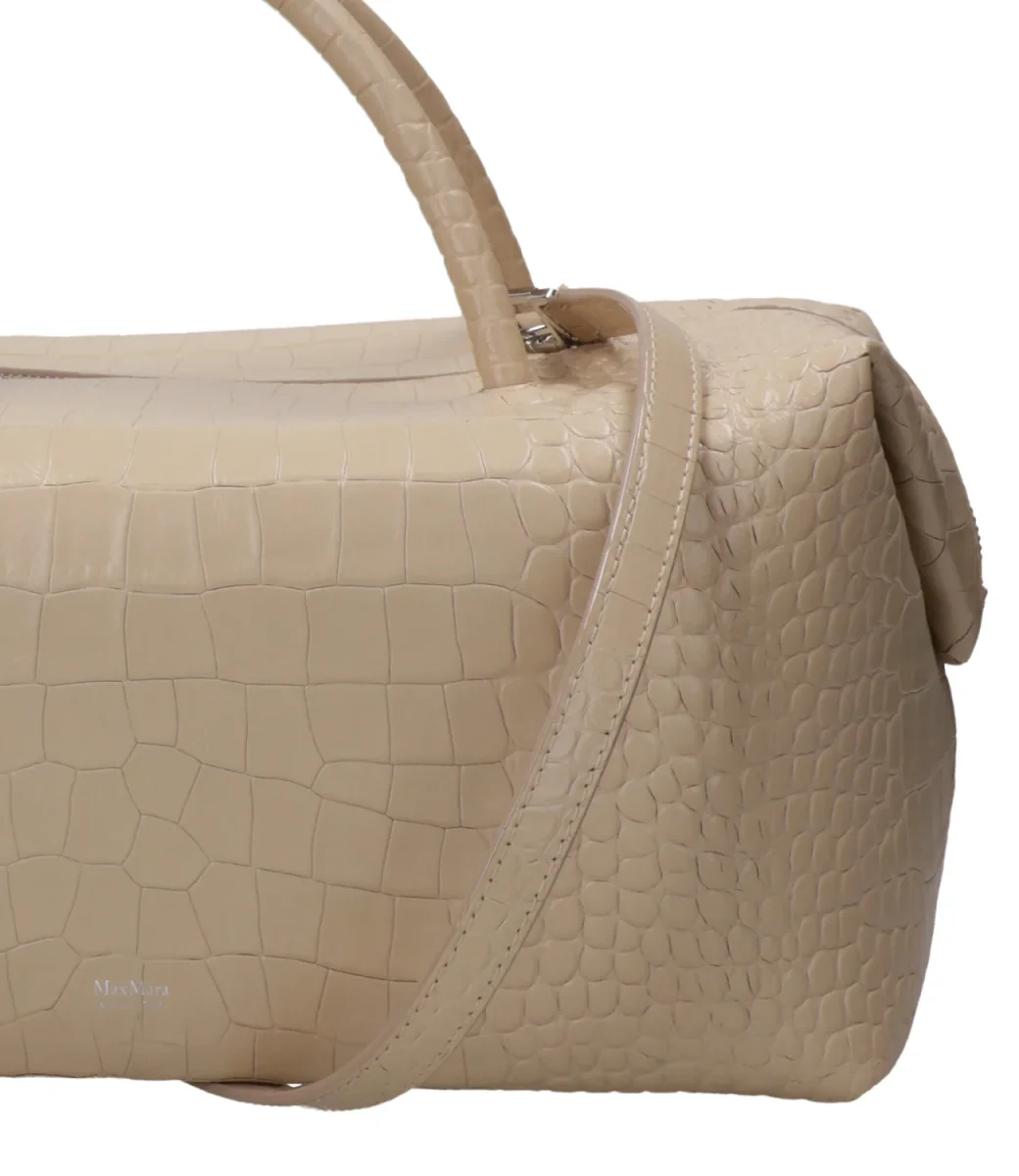 Borsa a mano Max Mara Mxaombrato4 modello bauletto in morbida pelle di vitello stampa coccodrillo e interni in suede, fianchi ripiegati a forma di M con calamita, manici fissi con lucchetto e tag portachiavi personalizzati.
