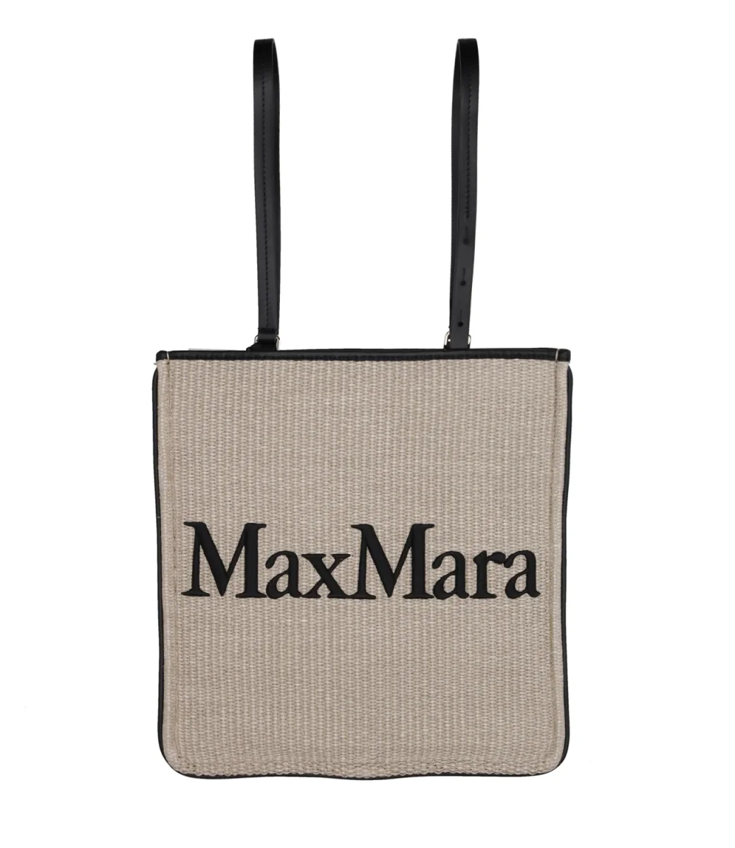Borsa Max Mara in rafia modello Easybag con dettagli in pelle, manici regolabili e logo frontale stampato, chiusura con zip.
