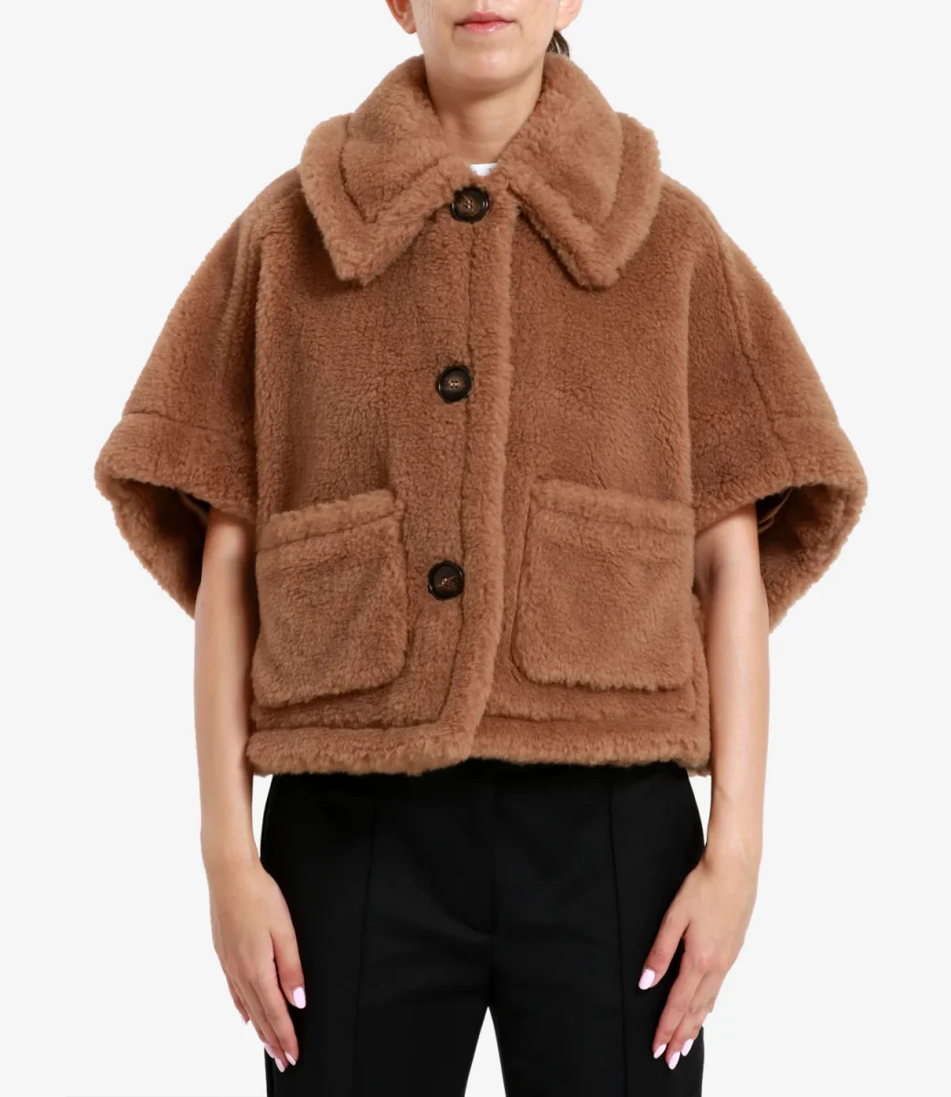 Cappa Max Mara Newterzo realizzata nell’iconico tessuto Teddy di cammello su base seta. Modello a mantella corta linea boxy con ampio colletto a camicia che poggia sulle spalle, ampie maniche corte, tasche applicate.