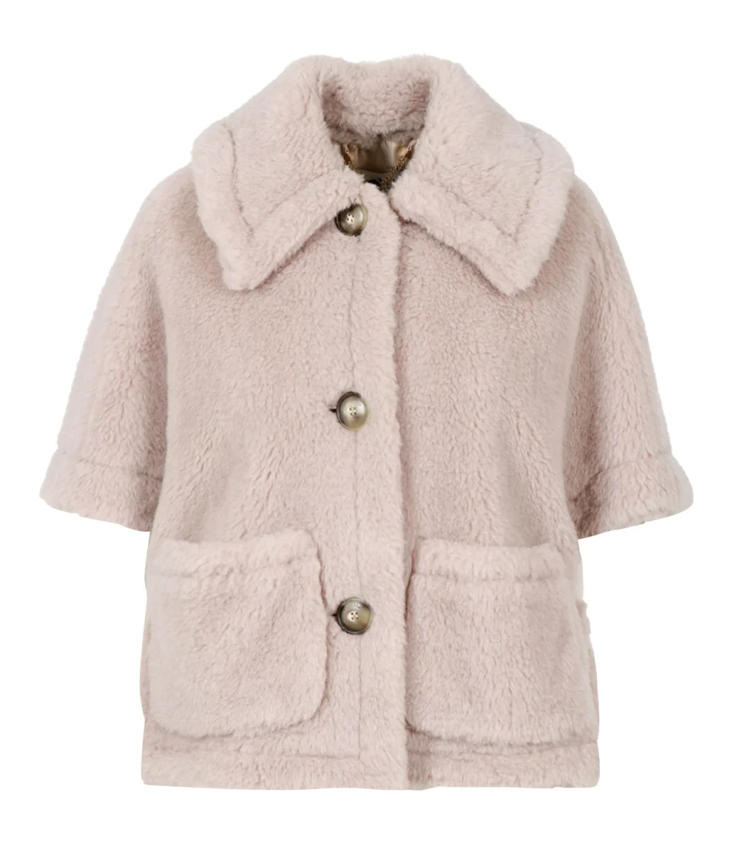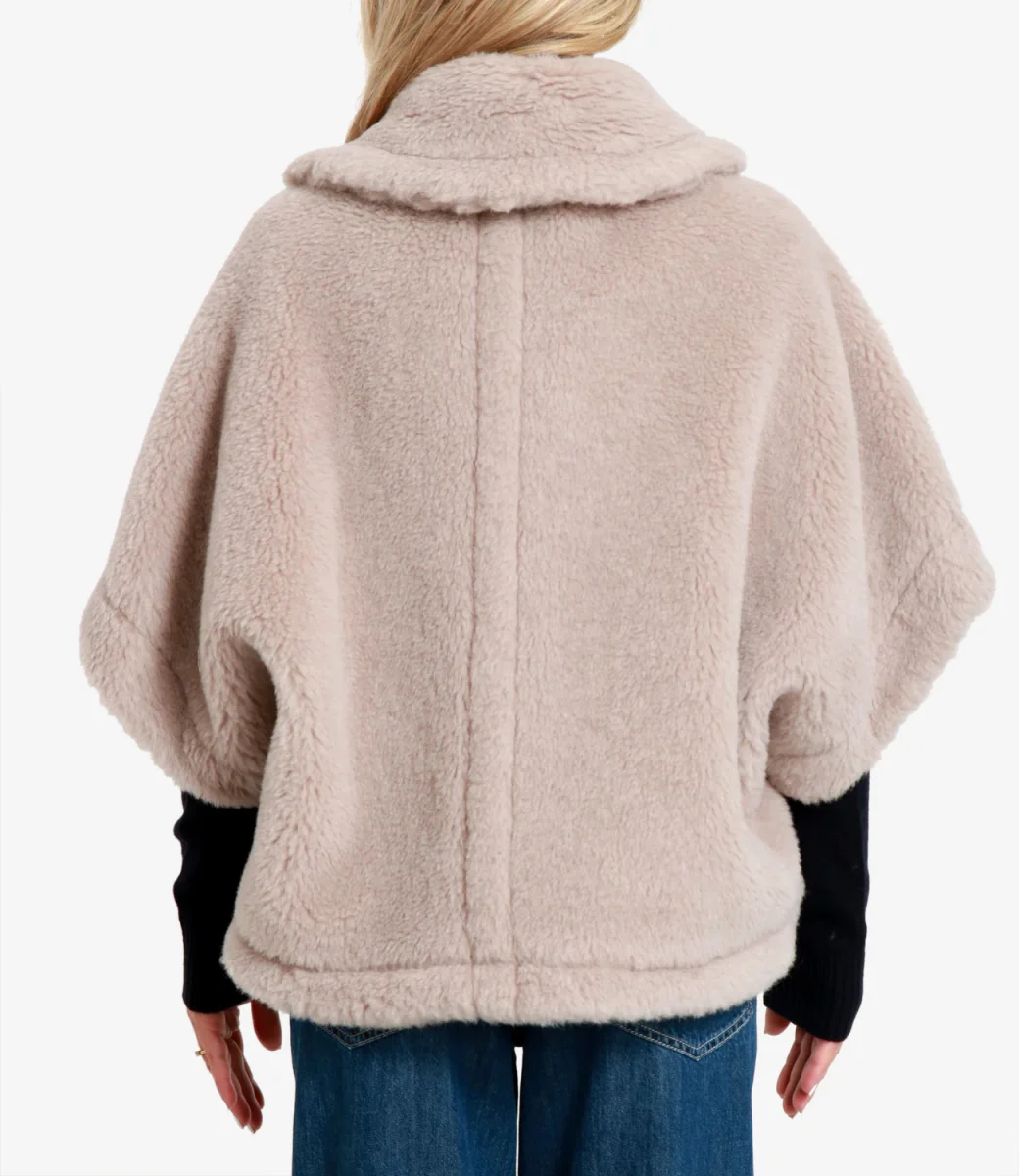 Cappa Max Mara Newterzo1 realizzata nell’iconico tessuto Teddy di cammello su base seta. Modello a mantella corta linea boxy con ampio colletto a camicia che poggia sulle spalle, ampie maniche corte, tasche applicate.
