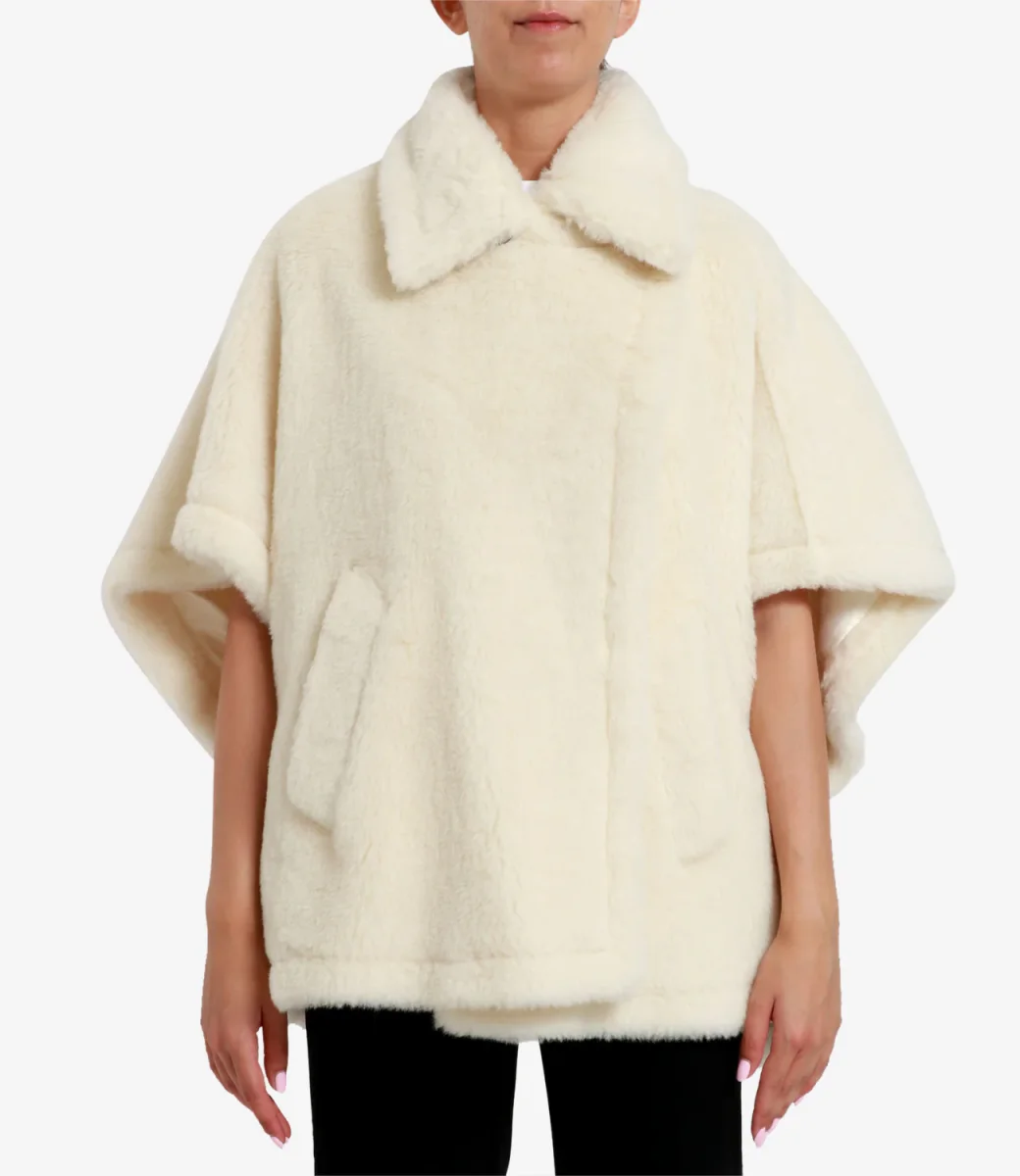 Cappa Max Mara Tebe1 realizzata nell’iconico tessuto Teddy di alpaca e lana su base seta. Modello a mantella corta con maxi colletto a punta, ampie maniche corte, tasche a filetto oblique. Fodera in viscosa e chiusura asimmetrica con bottone.
