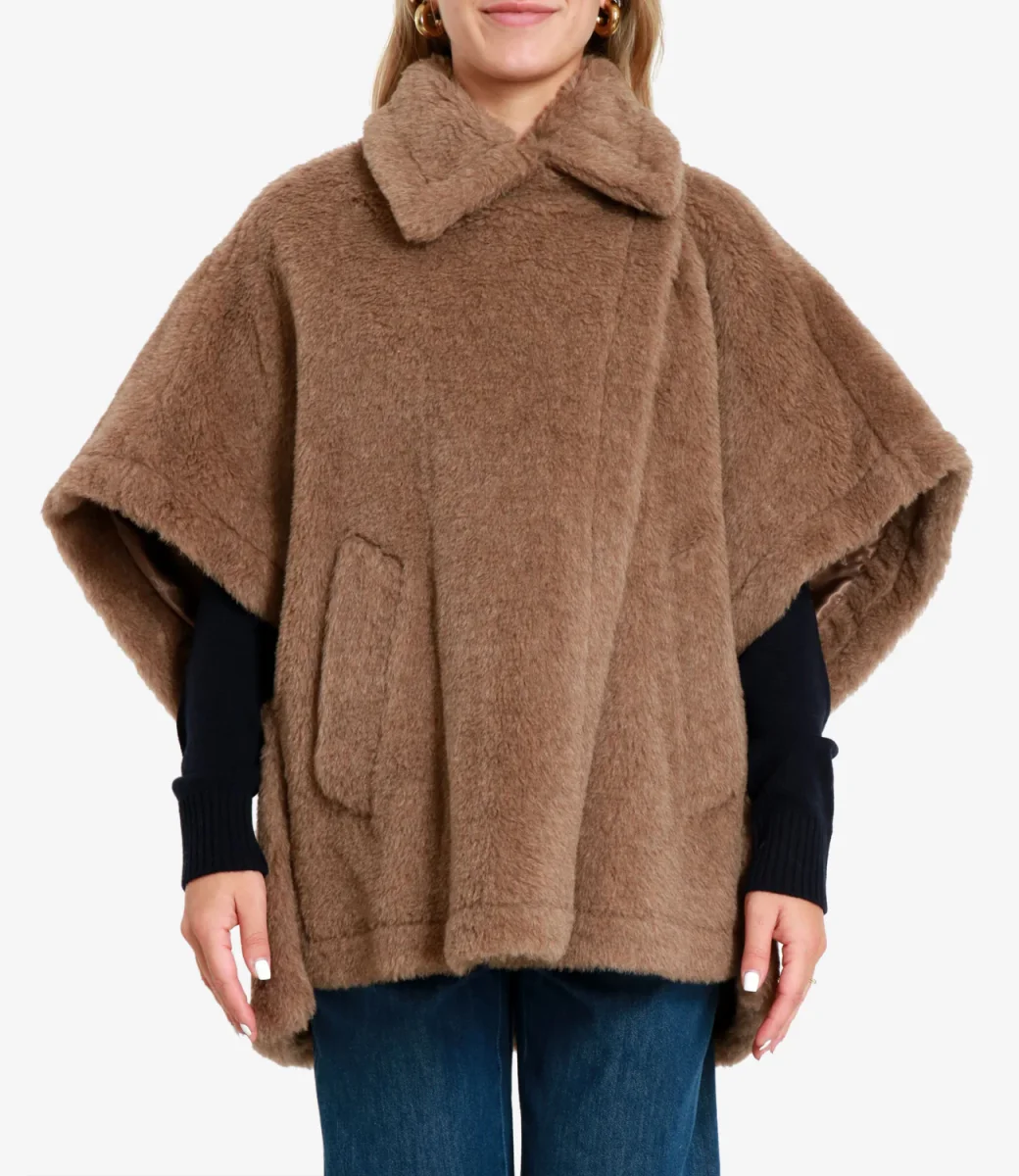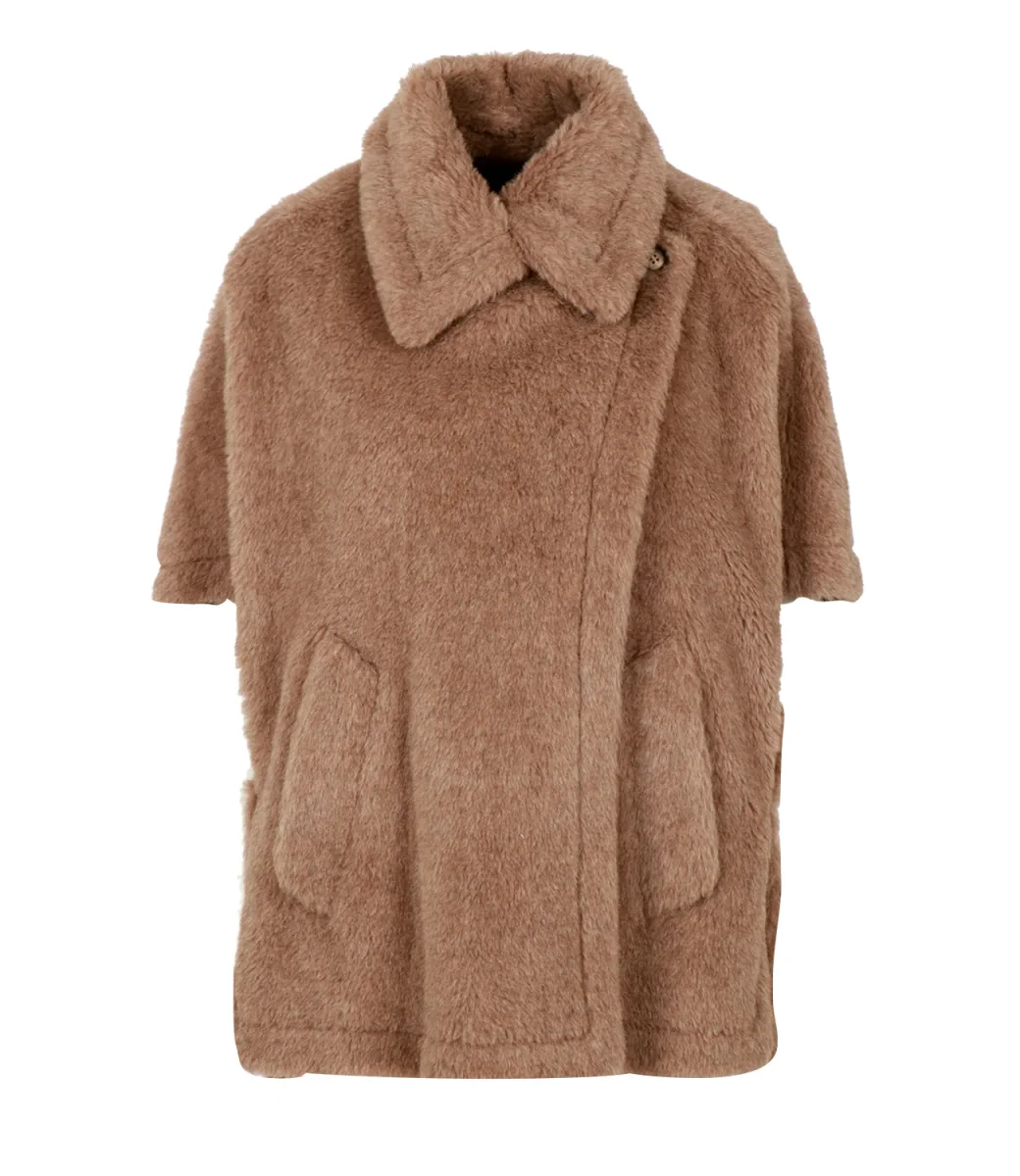 Cappa Max Mara Tebe4 realizzata nell’iconico tessuto Teddy di cammello su base di seta. Modello a mantella corta con maxi colletto a punta, ampie maniche corte, tasche a filetto oblique. Fodera in viscosa e chiusura asimmetrica con bottone.