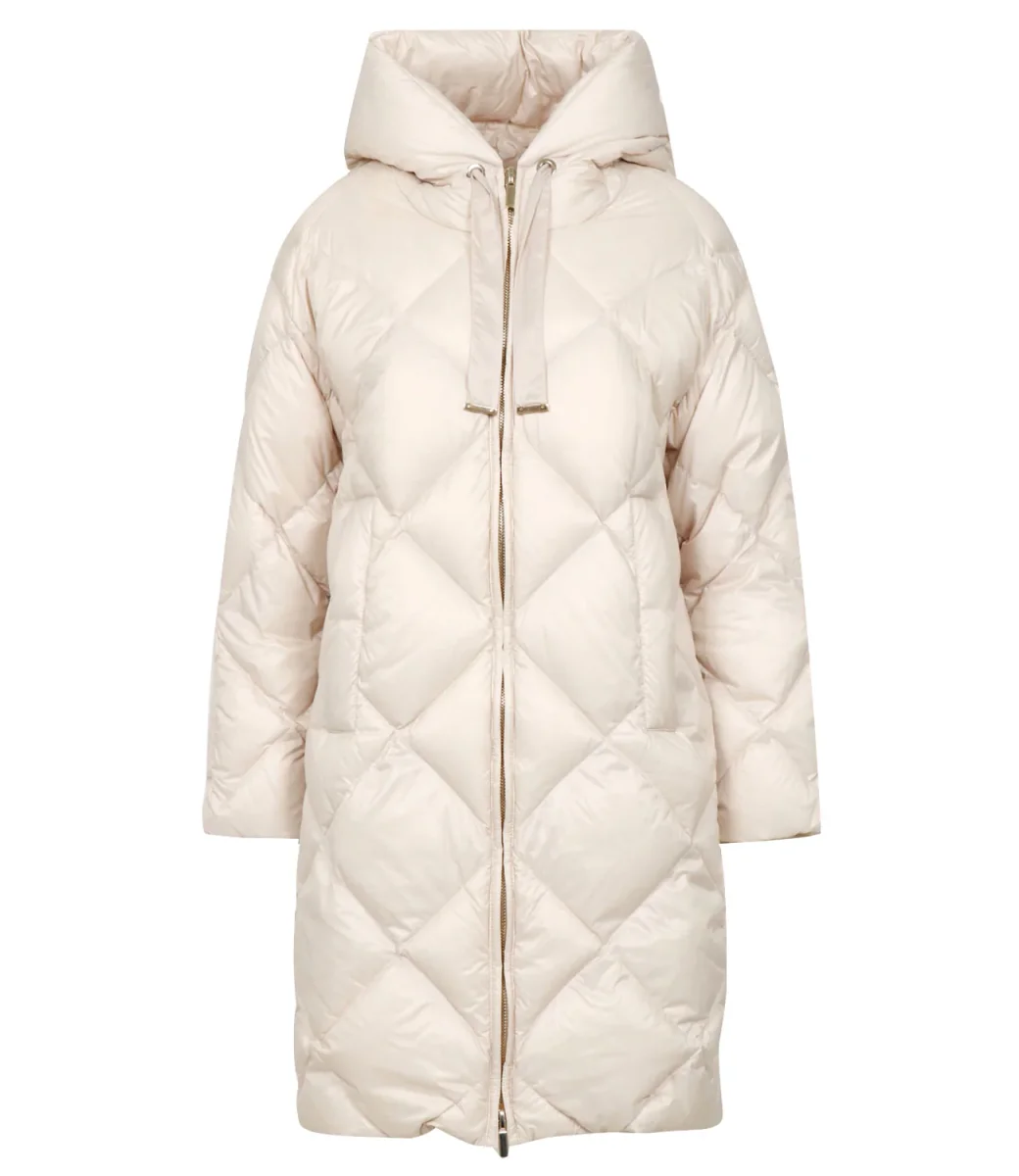 Piumino Max Mara The Cube Trefe in tessuto tecnico in tela cangiante antigoccia. Modello dalla lunghezza midi con motivo a rombi trapuntato all over con dettaglio a righe orizzontali al fondo sul retro.