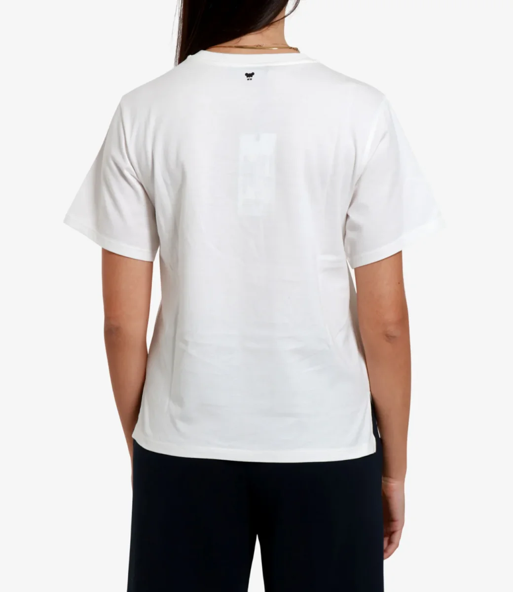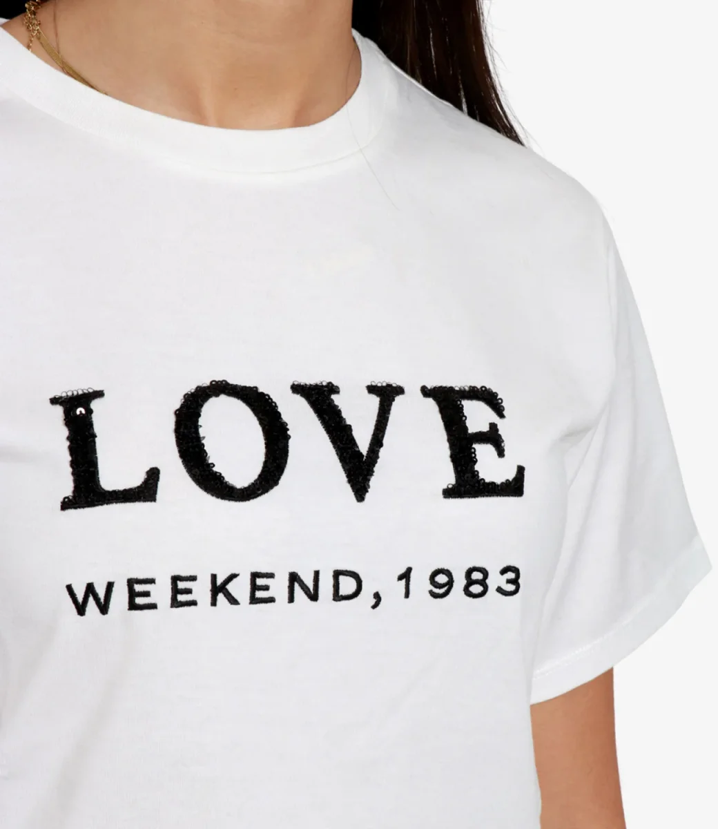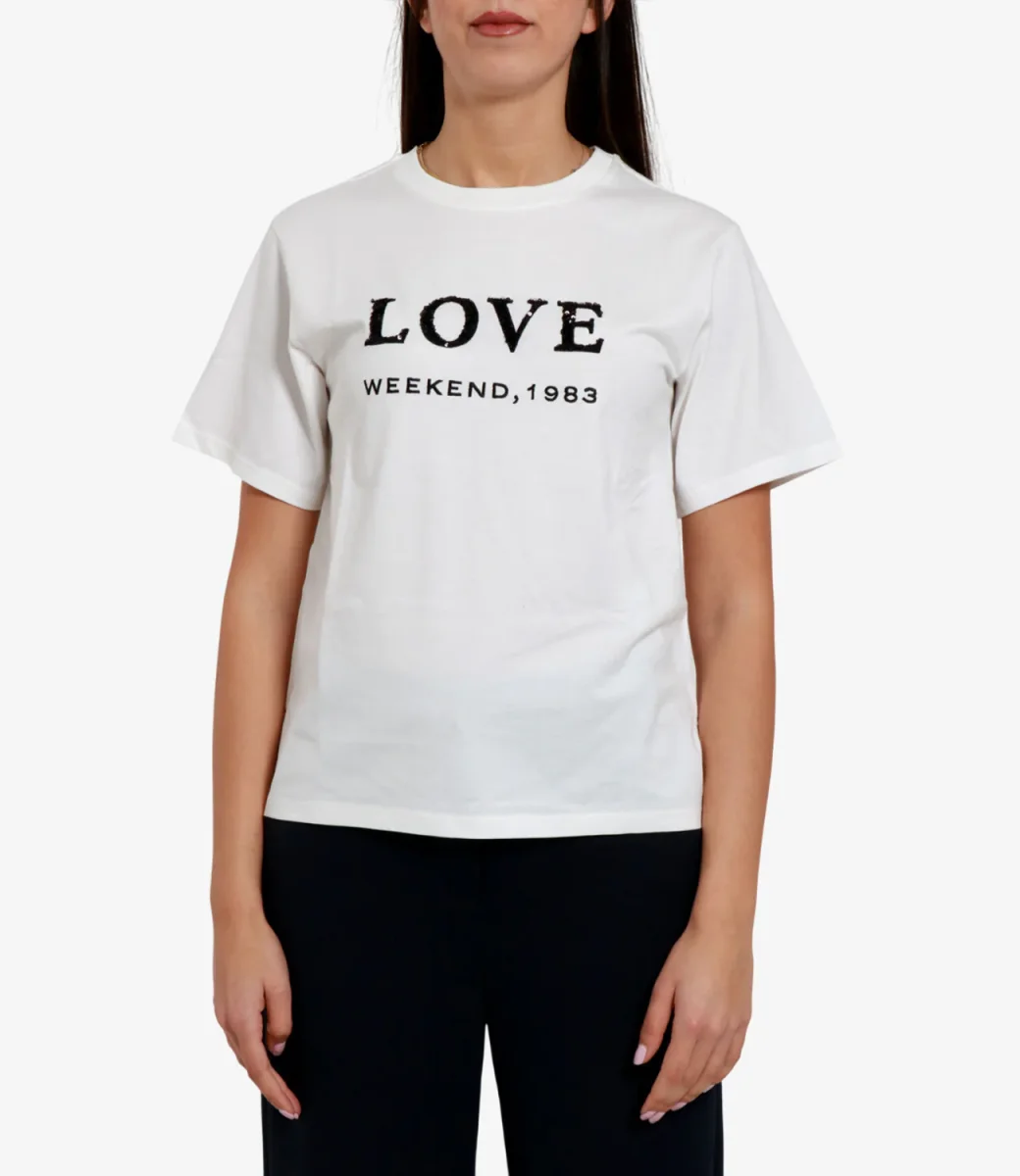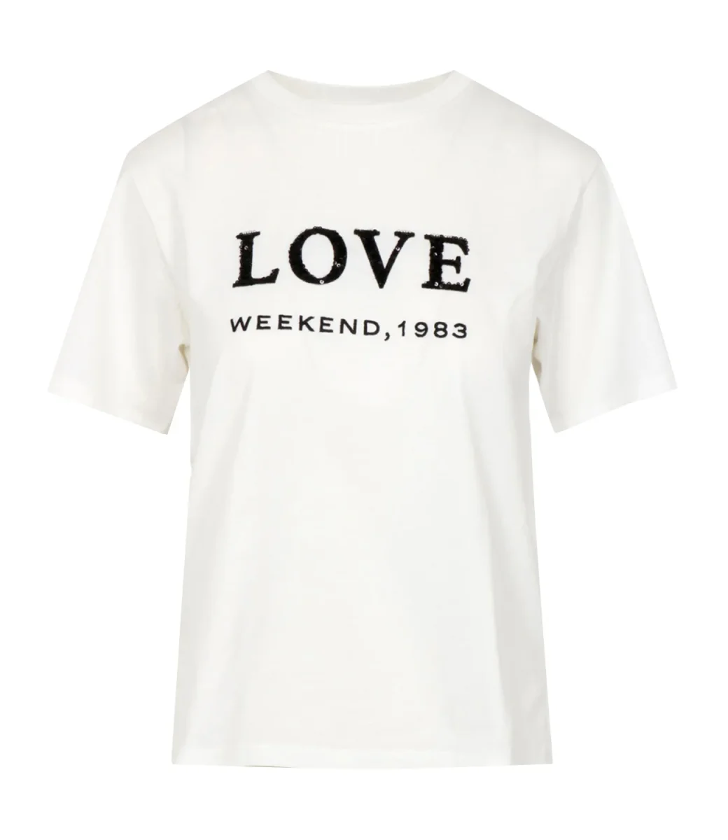 T-Shirt Max Mara Weekend Wkdagile in jersey di puro cotone, linea dritta con spacchi laterali, girocollo a costine e maniche corte. Sul davanti stampa con ricami; sul retro del collo piccolo logo farfalla ricamato.