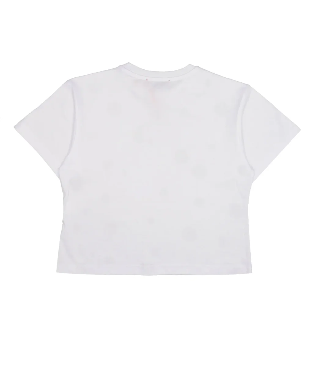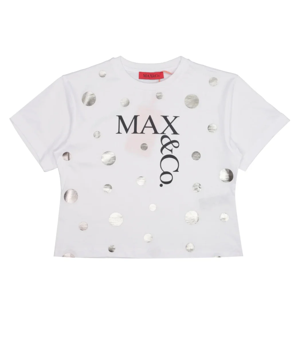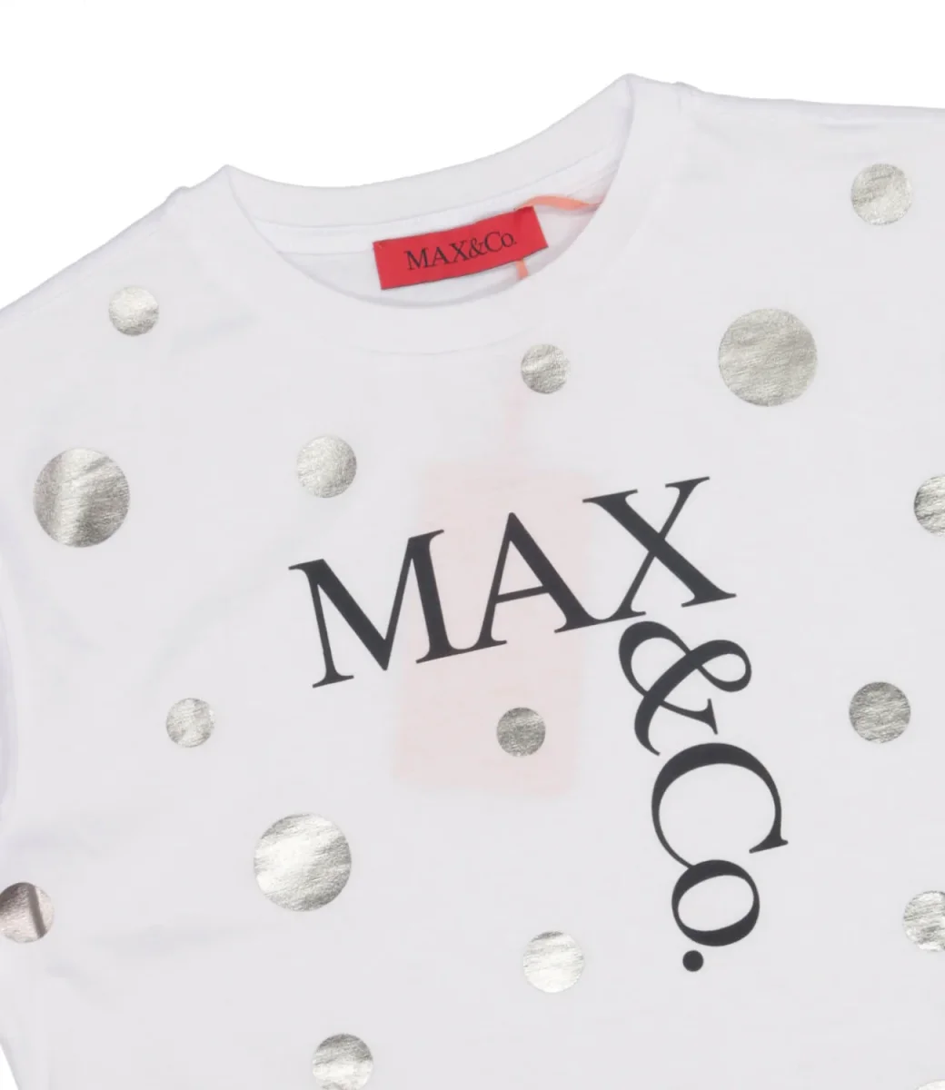 T-Shirt Max&Co Kids modello in cotone con logo e pois a contrasto per un tocco grafico e contemporaneo da indossare ogni occasione quotidiana per un look casual o sofisticato in abbinamento della propria gonna in collezione.
