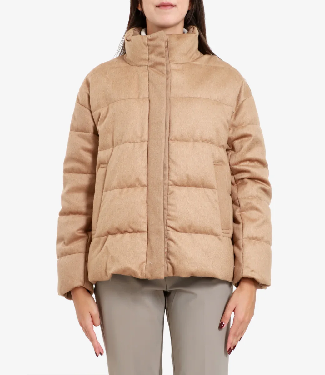 Piumino MaxMara in poliestere beige con motivo trapuntato orizzontale, chiusura frontale con tasche e tasche laterali. Orlo e polsini elastici.