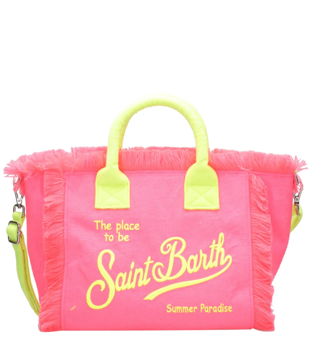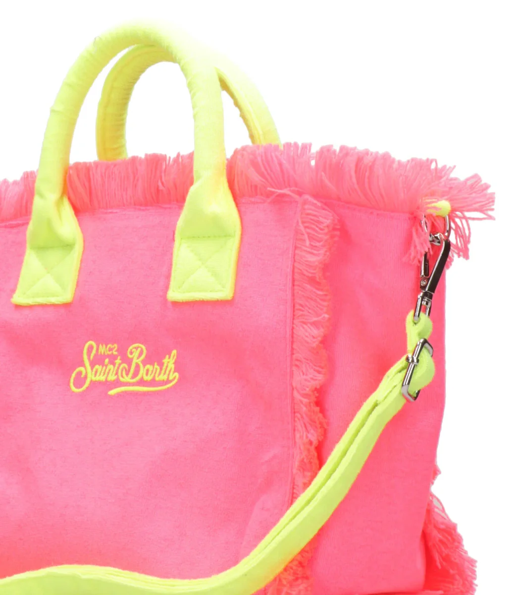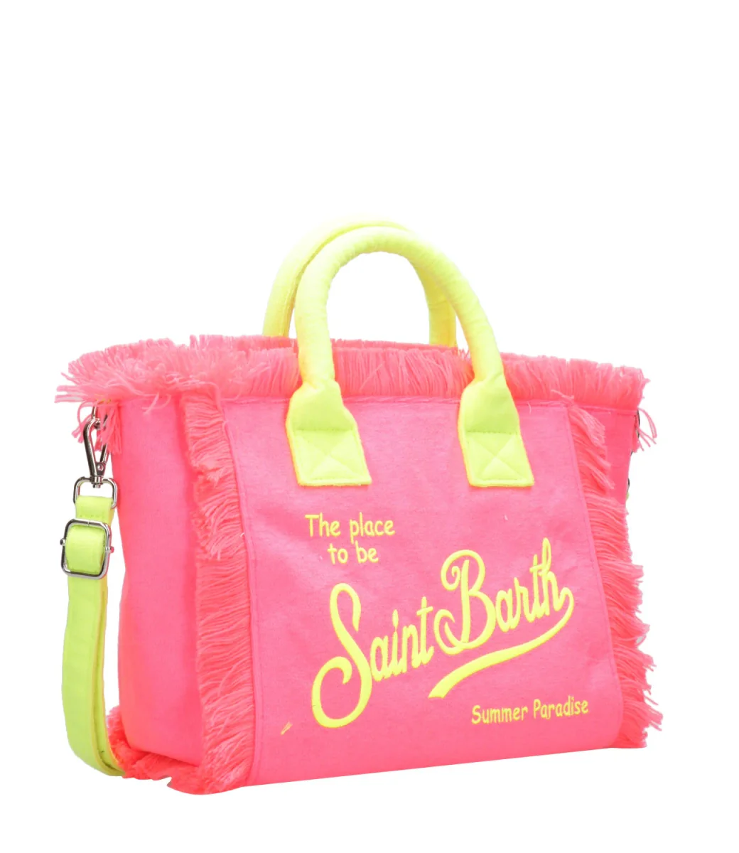 Borsa a Mano MC2 Saint Barth in spugna, frange laterali, manici in canvas, logo “Saint Barth” sulla parte frontale.