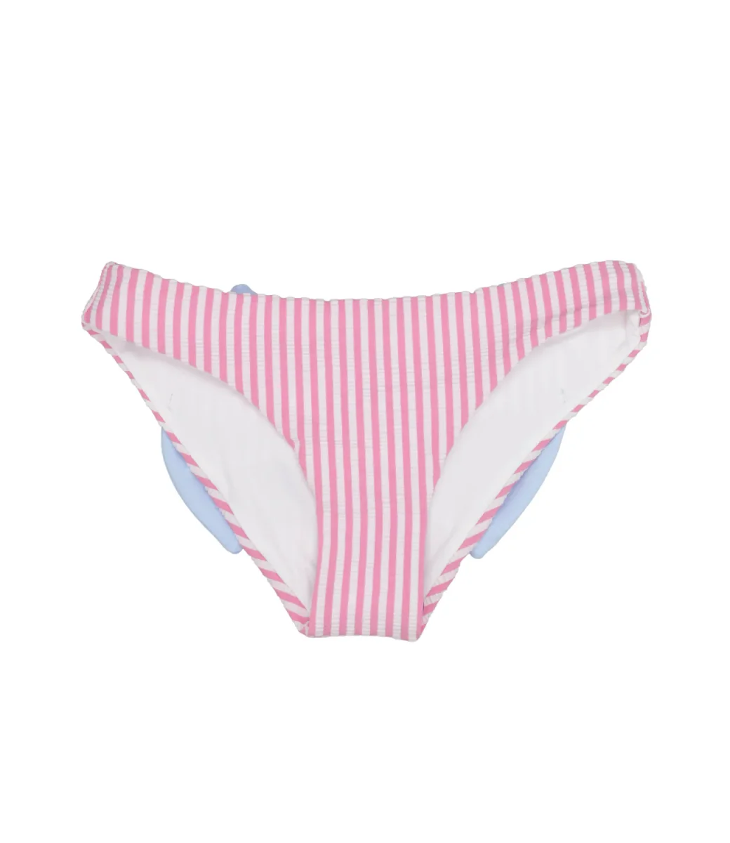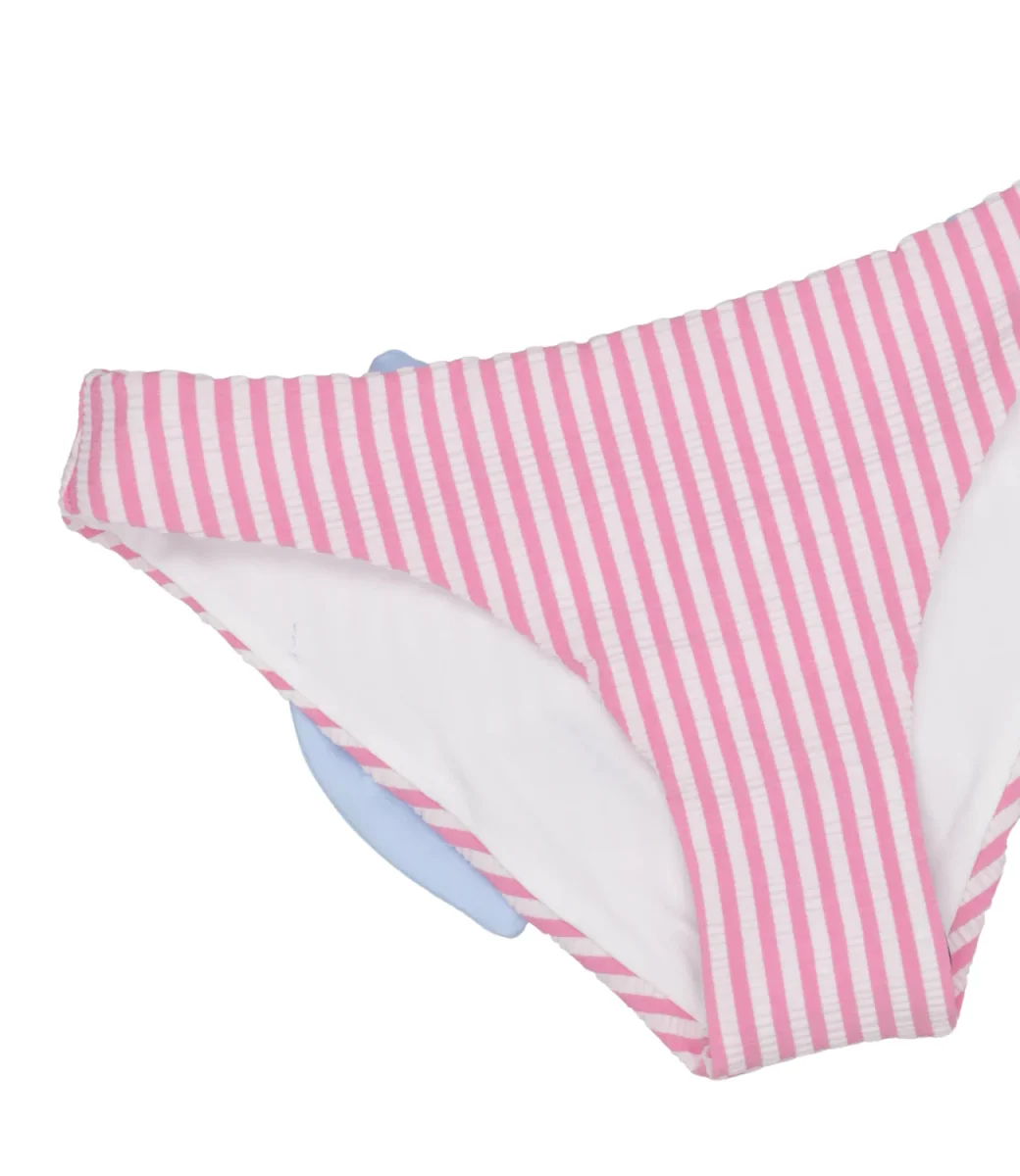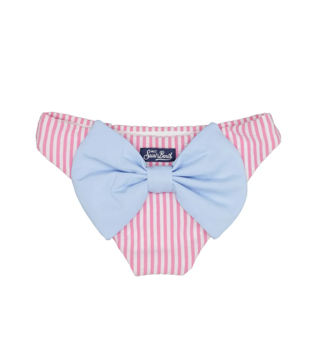 Costume slip MC2 Saint Barth Kids in lycra in fantasia a righe verticali e maxi fiocco applicato sul retro.