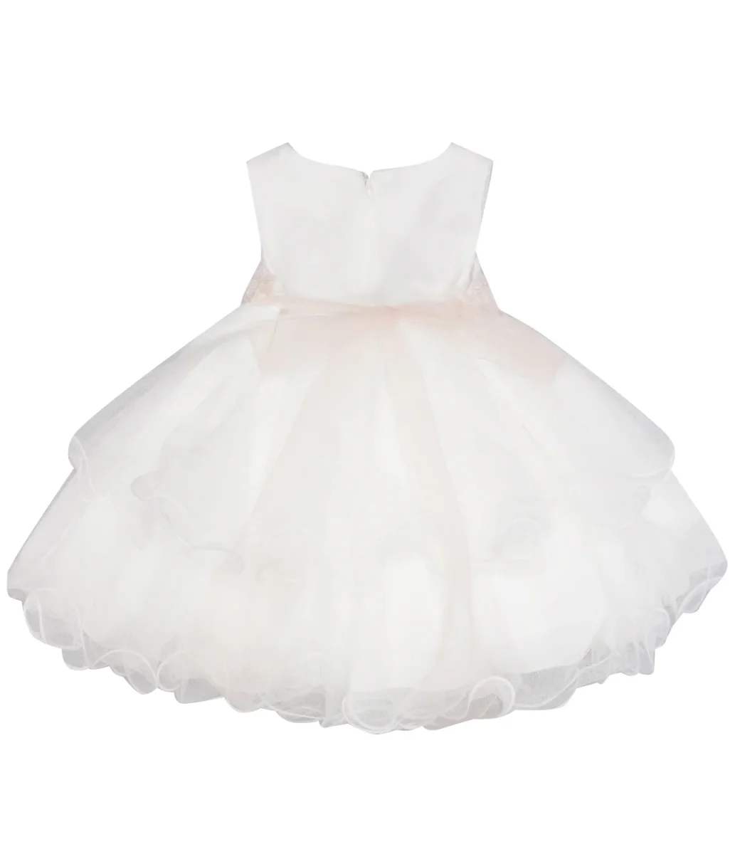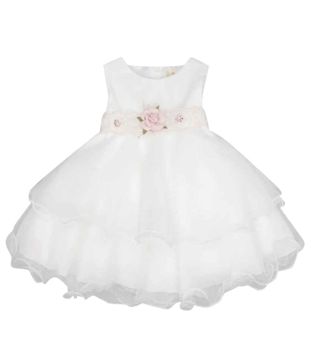 Abito Mimilù in raso e tulle. Linea romantica da cerimonia con girocollo ampio senza maniche, gonna ampia con balze in tulle e cintura ricamata imprezziosita con appliazioni di fiori.
